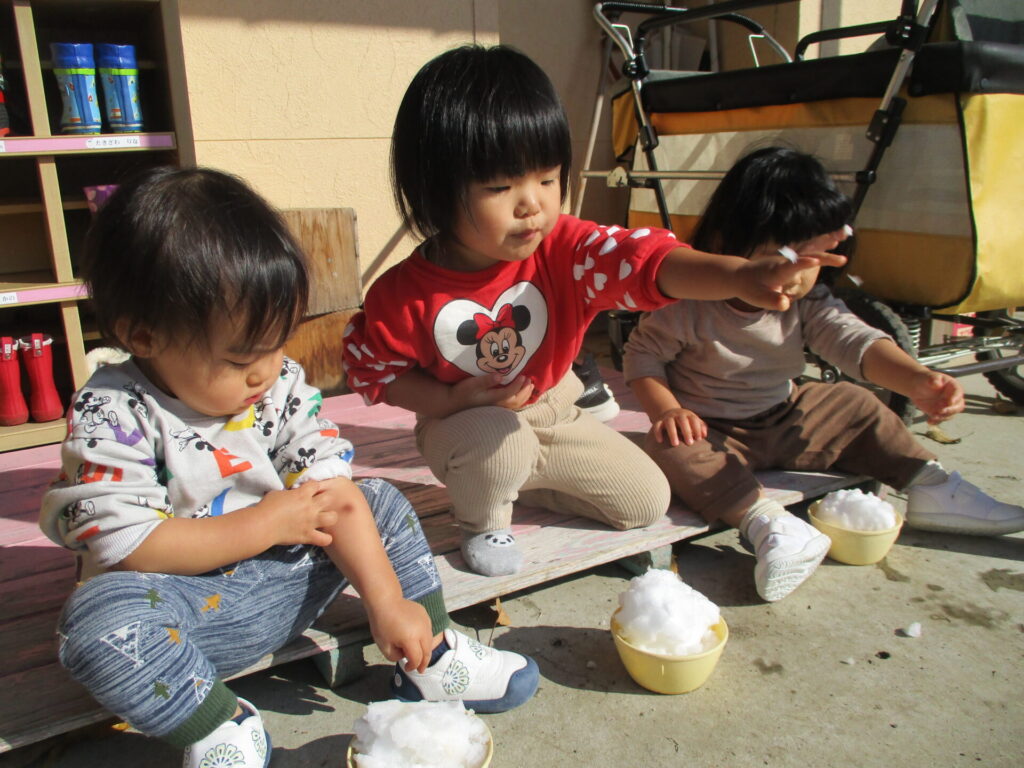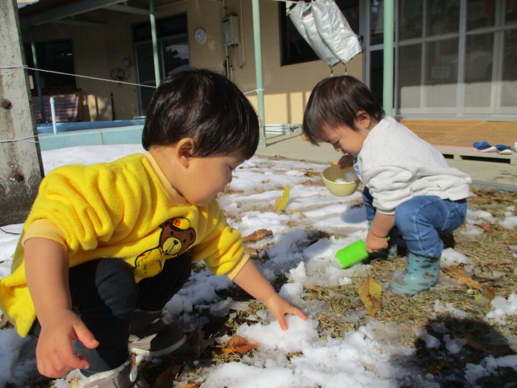 1歳児さんは初めての雪遊びのお友達もいました。雪をカップに入れてみると興味津々!「なんだろう」と不思議そうに眺めたり、お友達や保育士が雪を触っているのを見て少しずつ指先でチョンと触ってみたり…