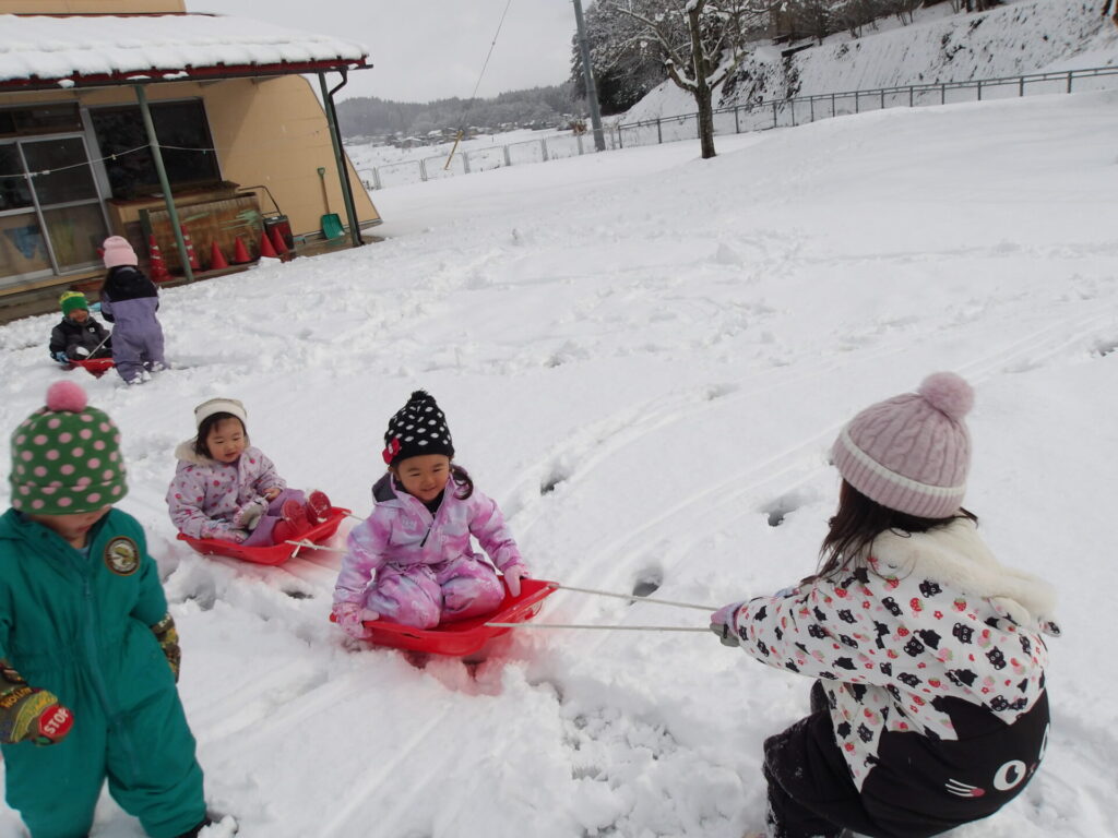 だんだんと積雪も多くなってきた1月。そり遊びではお兄さんお姉さんたちが引っ張ってくれて自然と異年齢のかかわりも見られます。