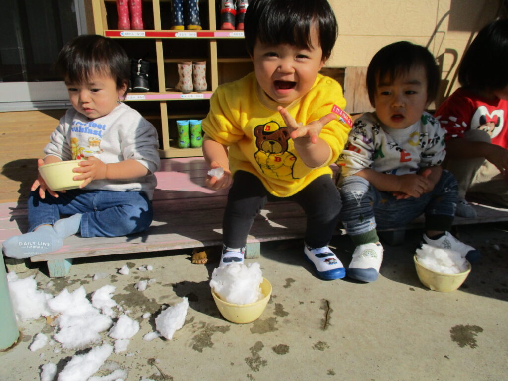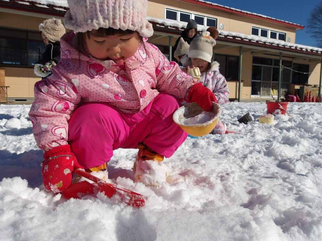 日によってふかふかな新雪の日には手で集めてみたり、丸めて固めて「アイス」「かき氷」とお店屋さんごっこも始まります。