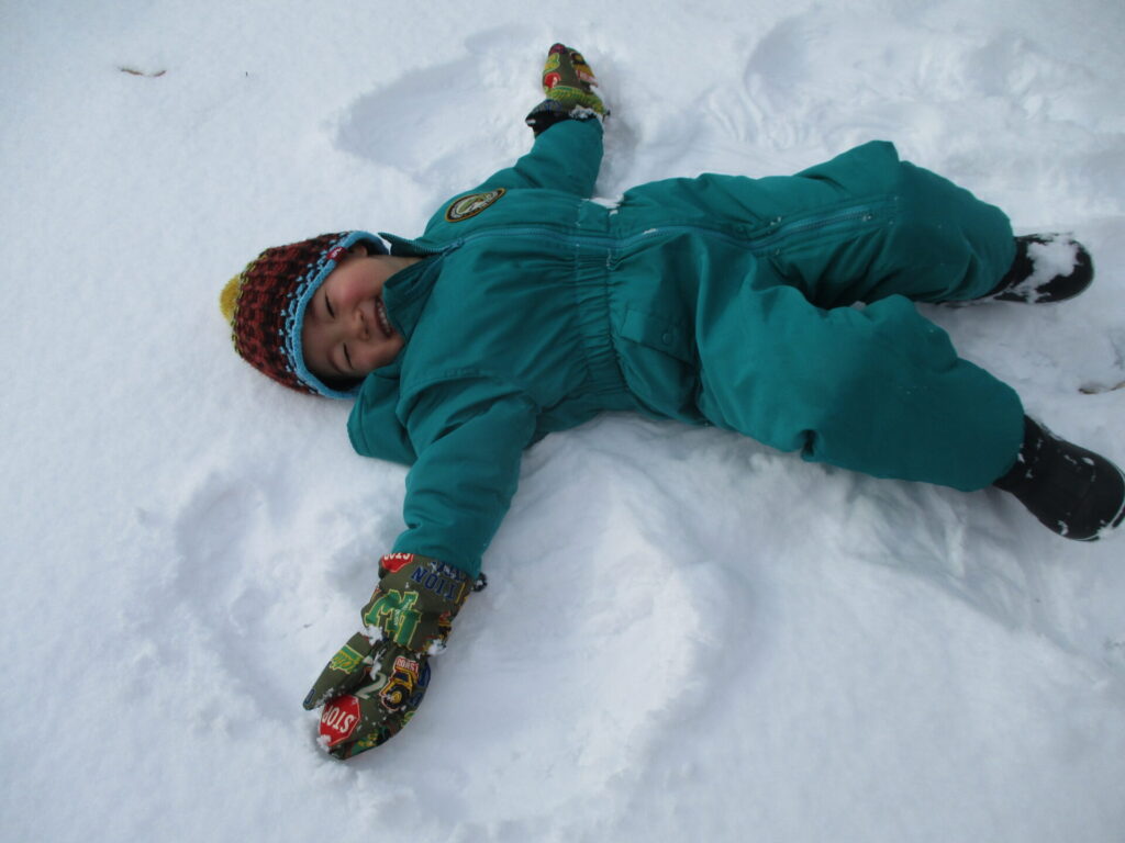雪が降っている日には「大きい雪が降ってるね」と雪の粒や結晶の大きさに気が付き、じっと降ってくるのを見ているお友達。雪が顔にかかると「冷たい!!」「あれ?なくなっちゃた」と雪の冷たさや溶けていく様子を感覚で感じていたお友達もいました。