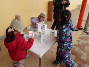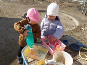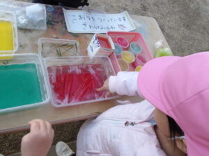 氷作りが始まりました。「いっぱい作ろう」「明日凍るの楽しみだな」
