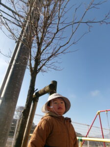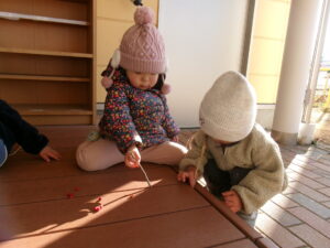 な〜ちゃんが園庭で棒を拾ってきて「そうだ。この棒でやってみよう」と言う。