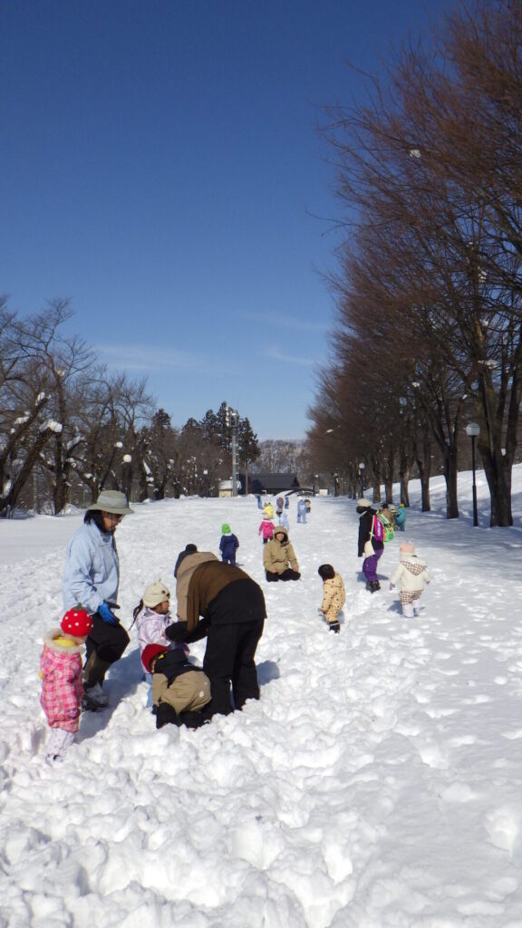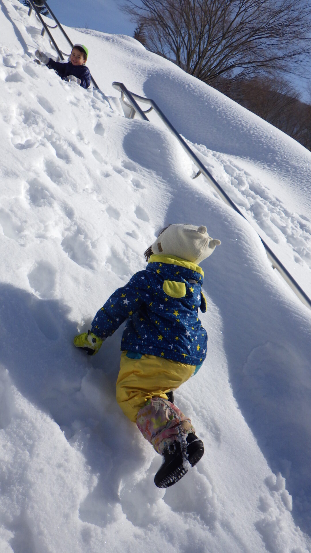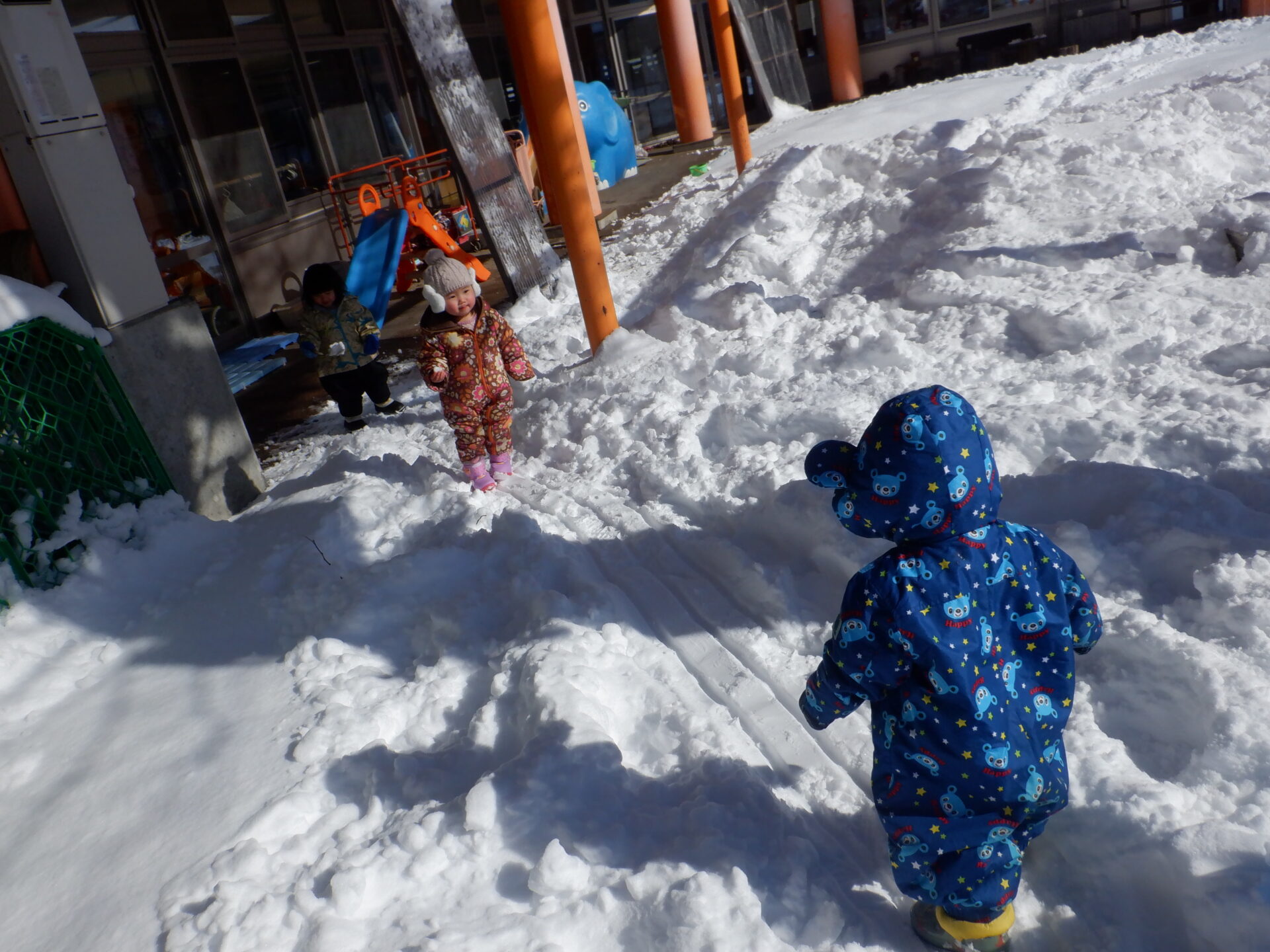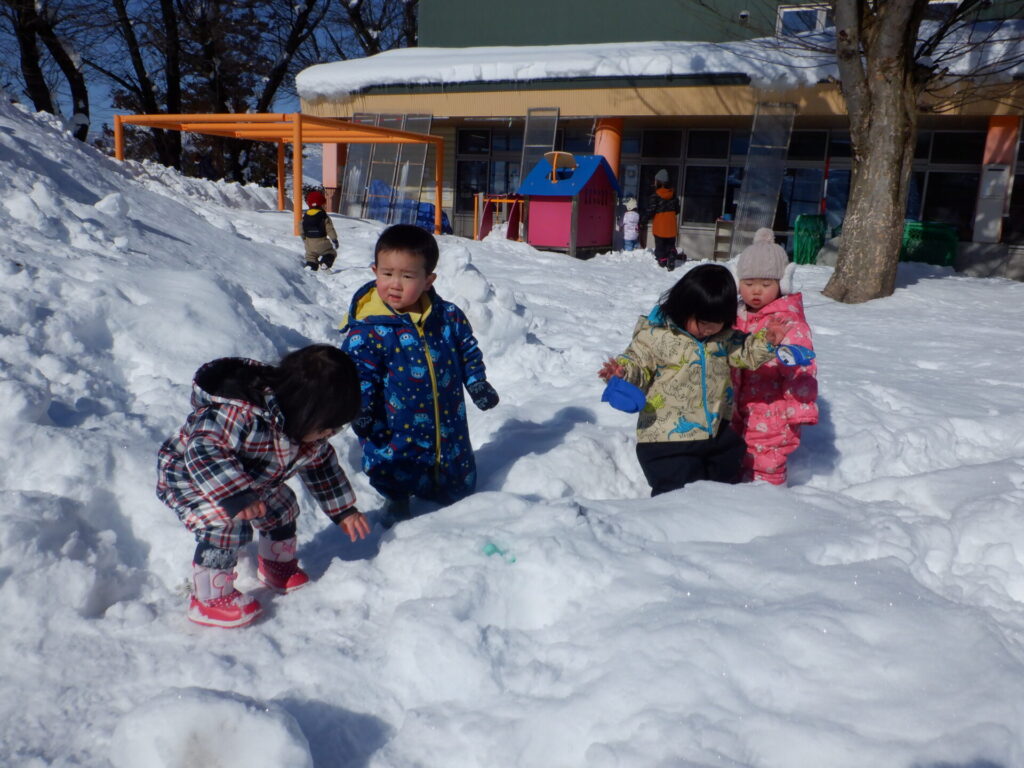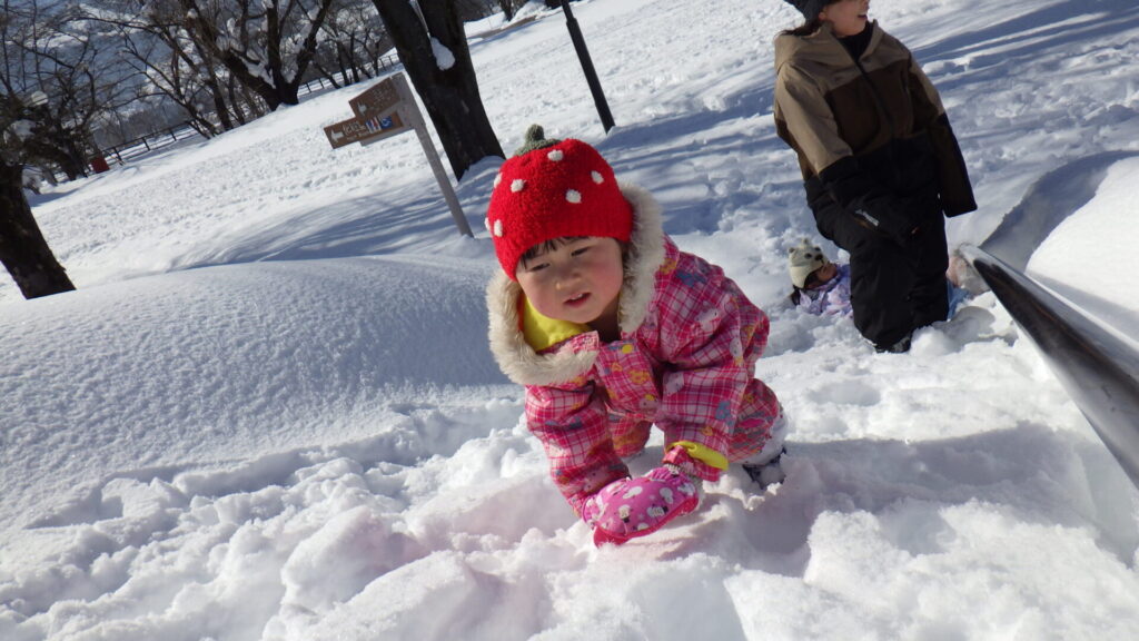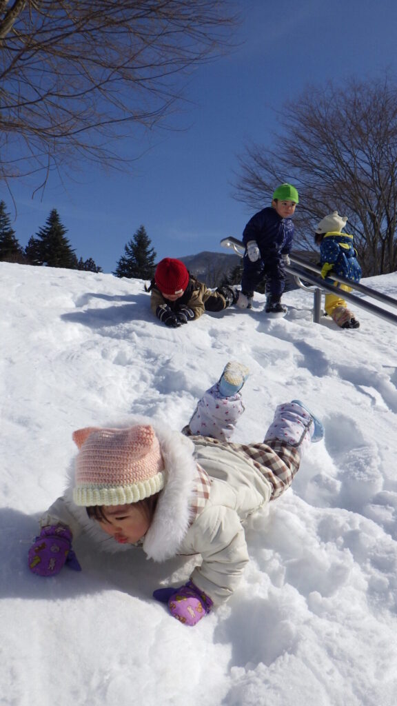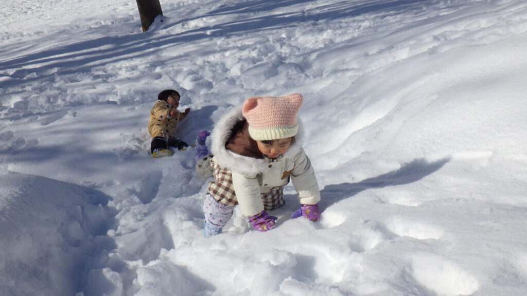 雪遊びの経験がまだ少ない1歳児。12月に雪遊びをし始めたころは不安定な雪の上を歩くとバランスを崩して何度も転んでしまい、座り込んだり、抱っこを求めたりする姿が多くみられました。まだそんな姿も見られますが、園庭で雪遊びの経験を積んで異年齢のクラスの友達が遊ぶ姿を見て『楽しそうだな』『真似してみよう』と体を動かして遊ぶ楽しみ方も感じることができるようになってきました。木島平の自然の中で体験できる、冬ならではの遊びをたくさん楽しんでほしいと思います。