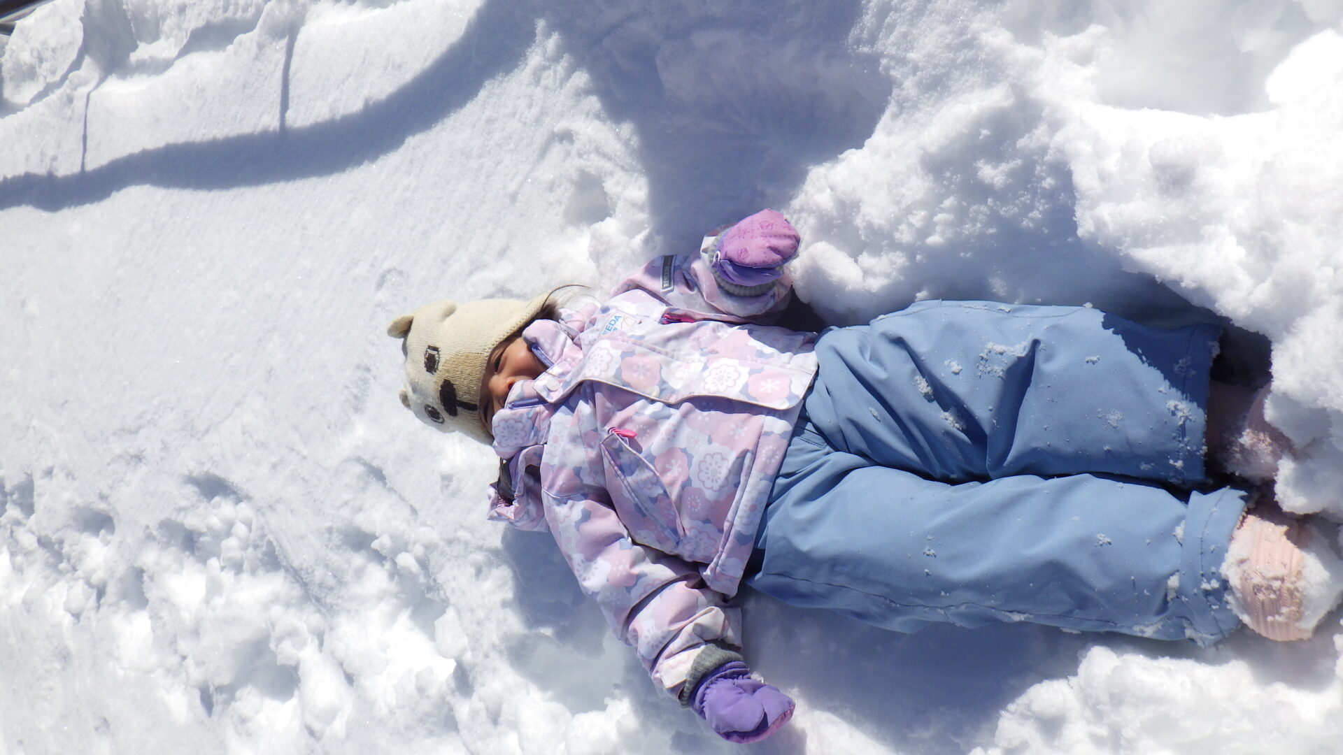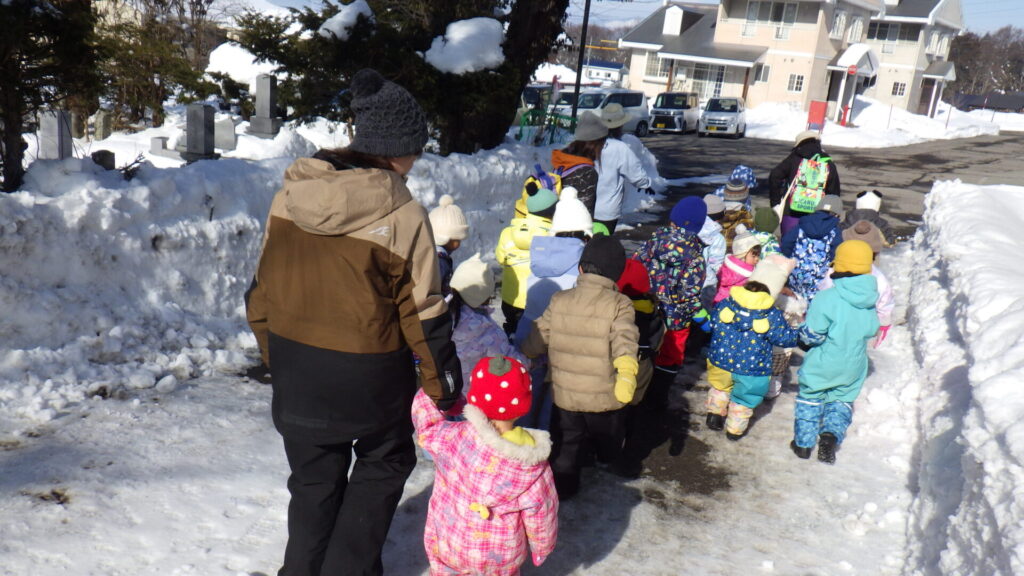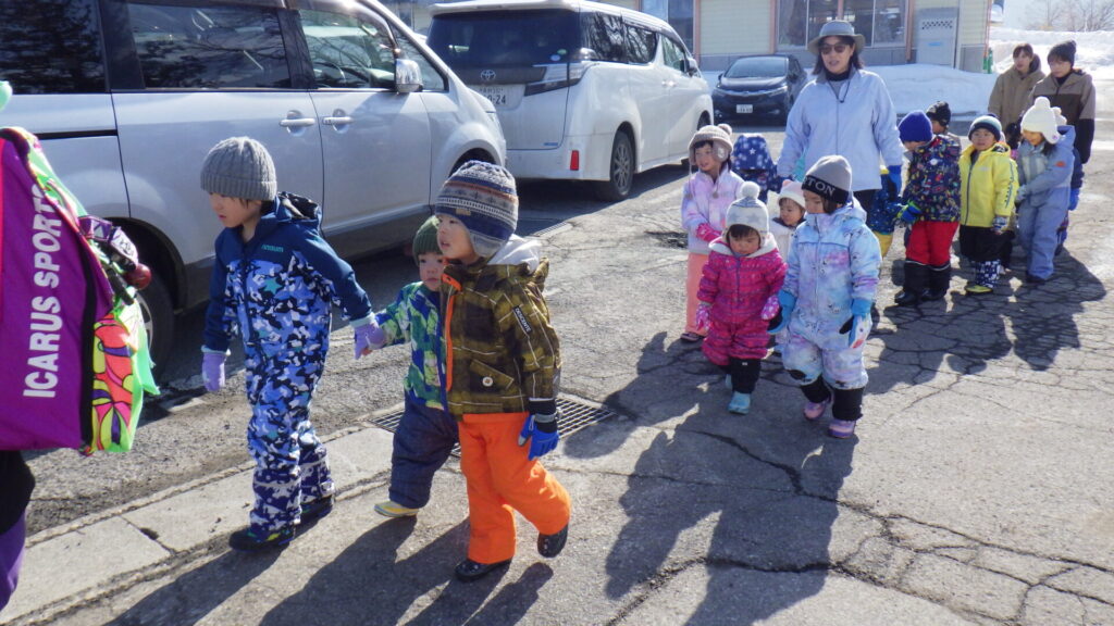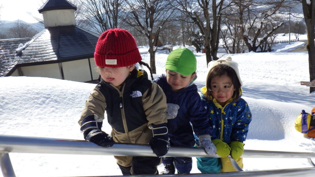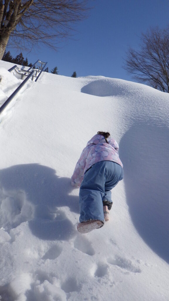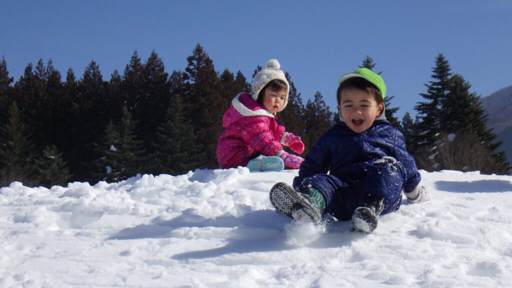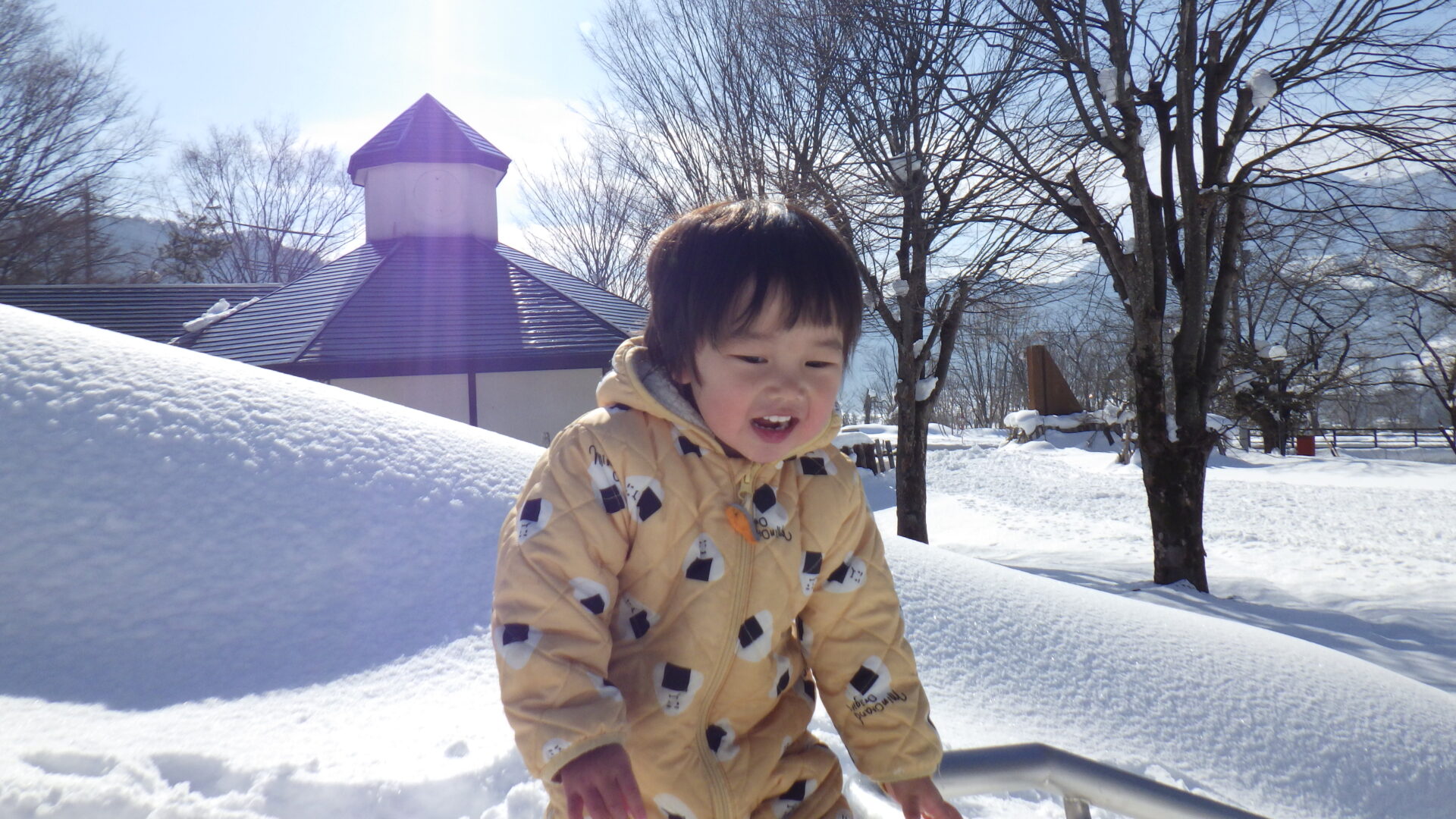 雪遊びの経験がまだ少ない1歳児。12月に雪遊びをし始めたころは不安定な雪の上を歩くとバランスを崩して何度も転んでしまい、座り込んだり、抱っこを求めたりする姿が多くみられました。まだそんな姿も見られますが、園庭で雪遊びの経験を積んで異年齢のクラスの友達が遊ぶ姿を見て『楽しそうだな』『真似してみよう』と体を動かして遊ぶ楽しみ方も感じることができるようになってきました。木島平の自然の中で体験できる、冬ならではの遊びをたくさん楽しんでほしいと思います。