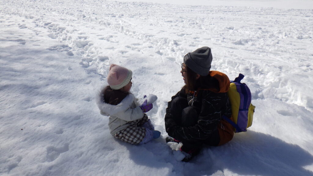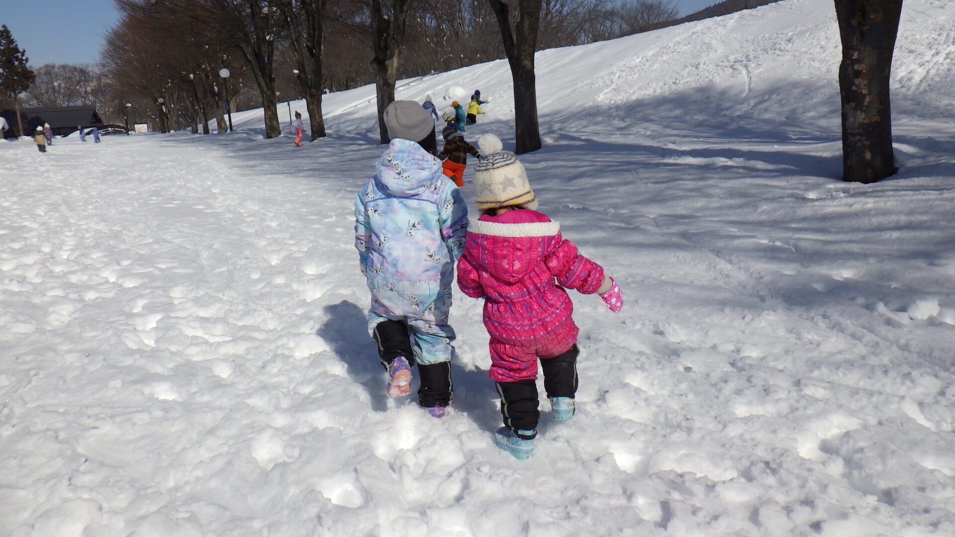 公園に到着です。駐車場は真っ白!4歳児さんの後を追いかけて1歳児さんも歩きますが雪に足を取られて4歳児さんのようにはすすめません。すると手をつないで歩いて行ってくれました。