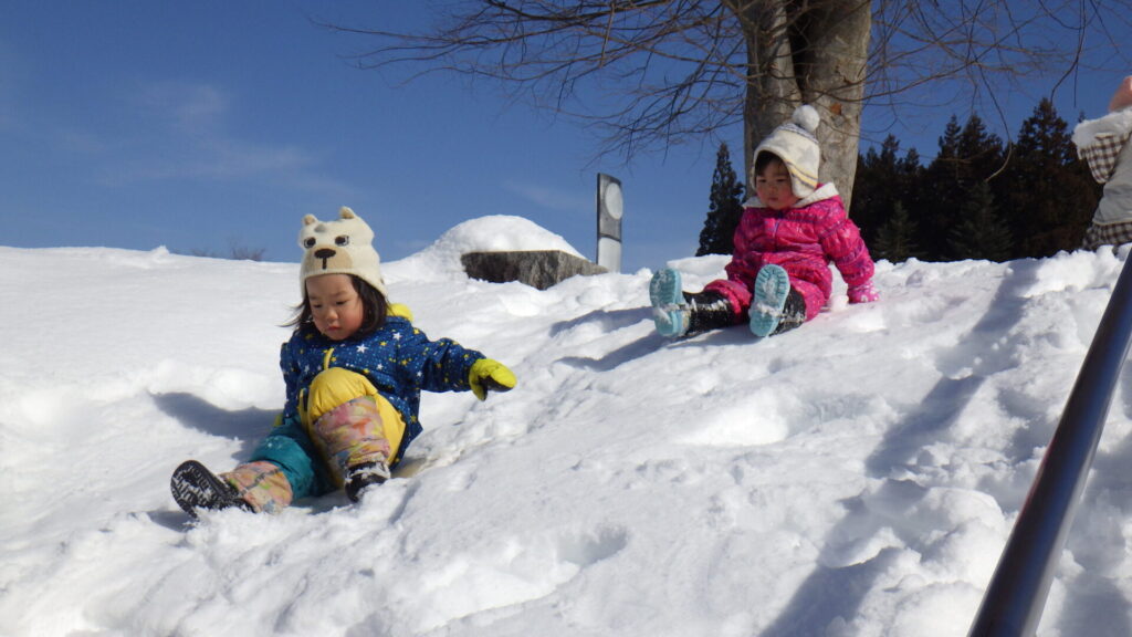 お友達の様子を見て真似したり先生と一緒になどいろんな体勢でお尻滑りや雪遊びを楽しみました!