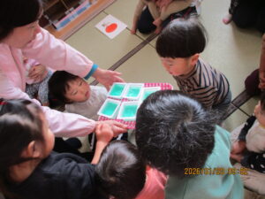 赤、黄、緑の鮮やかな色水が入っている小さな容器を見て、「明日にはカチカチになっていますように」とみんなでお願いをしました。
