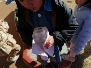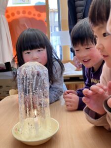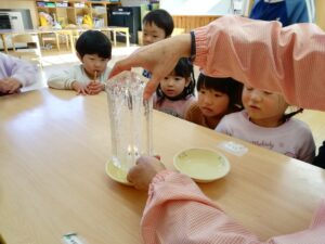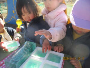 「先生、氷だよ!」「冷たいね~」など、子どもたちからたくさんの声が聞こえてきました。