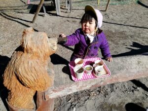 「くまさん、あーんして。どうぞ。美味しいよ!」