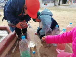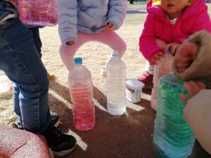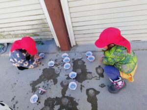 水を凍らせるために、連日のように太陽の光と影を見ながら置く場所を考えたり、容器の大きさや、色水を入れる量を変えたりしながら、試したり観察したりしていく中で、子どもたちはたくさんの発見をします。