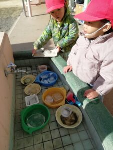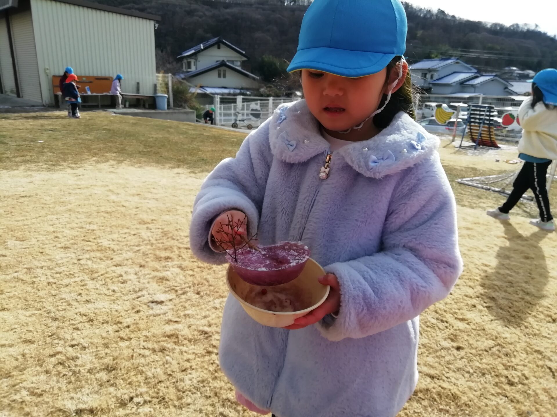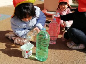 子どもたちと食紅や絵の具で色をつけた水、透明な水をたっぷり用意し、自分で選んだ容器に水を注ぎ、思い思いのところに容器を仕掛け、気温が下がり凍るのを待ちました。初めの頃は、午前中に仕掛けたものがもう固まっているかな?とお昼寝の後、張り切って見に行く姿も見られました。