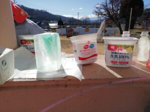 ・容器の底が膨らんだり、牛乳パックが破裂したり、と、凍るときに水が膨張すること