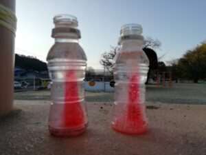 「あれ、色が下と真ん中に集まってる」 「きれい!宝石の入れ物みたい」 「ペットボトルを逆さまにしても、凍っていて水が出てこないよ!」