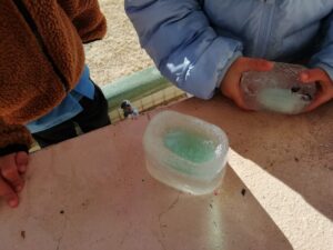 翌日の朝、自分が仕掛けたものがどうなっているかな、とワクワクしながら見に行くと、結果は様々でした。早朝は凍っていても、太陽の力は偉大で、光が降り注いですぐに氷が溶けてしまったり、残念ながら何の変化のないこともありました。