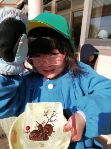 たくさん遊んでいくうちに、水の中に木の実や枝、葉などの自然物を入れて、素敵な氷の飾り物を作ったり、キャンドル作りをしたりと、遊びが発展していきました。