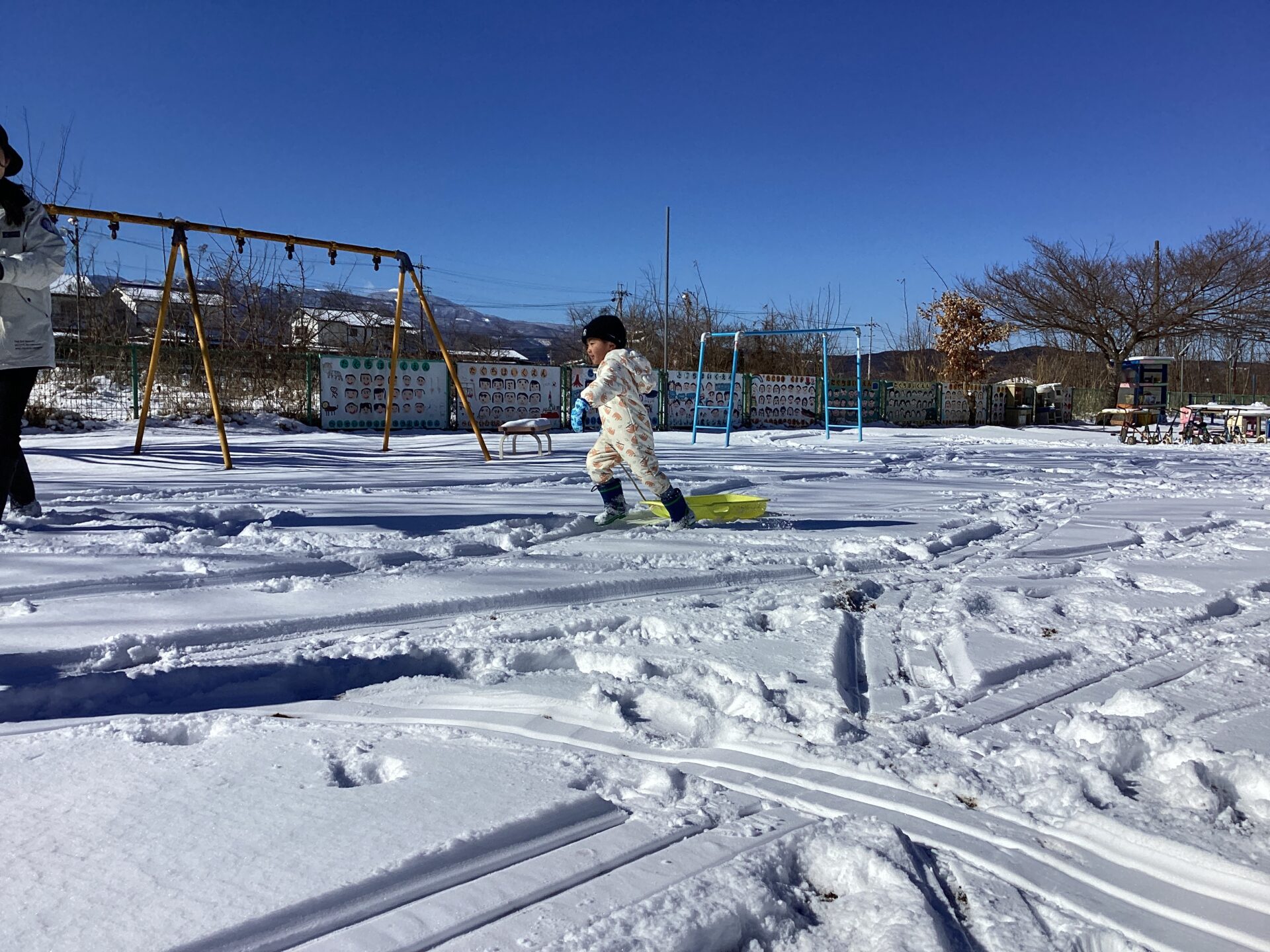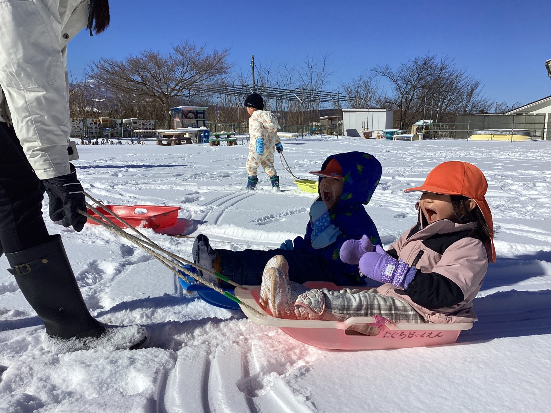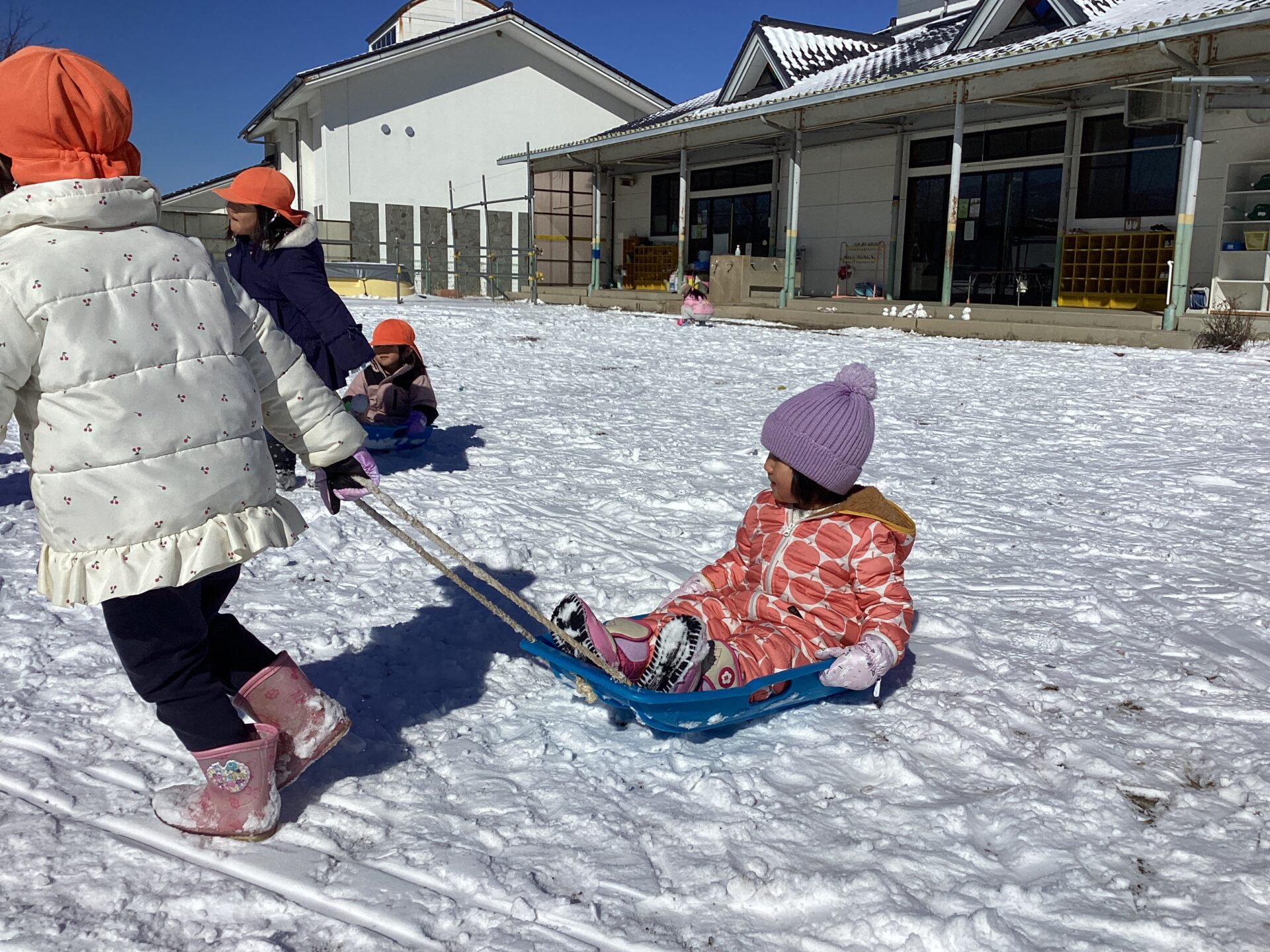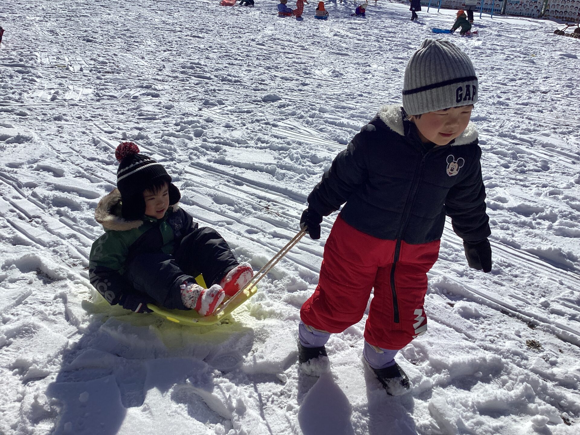 いつしか他のクラスのお友達もやってきて、そり遊びがさらに盛んになりました。