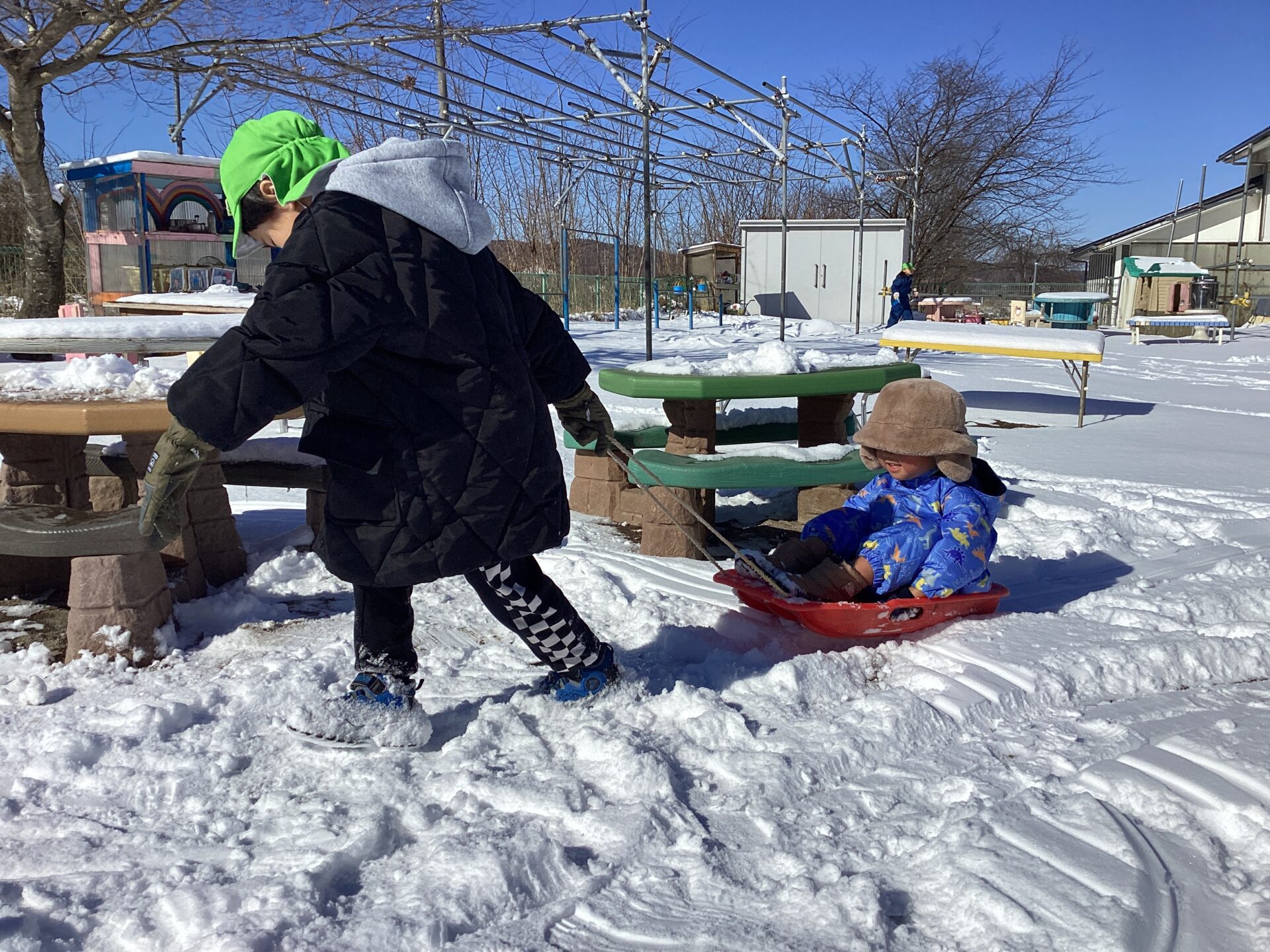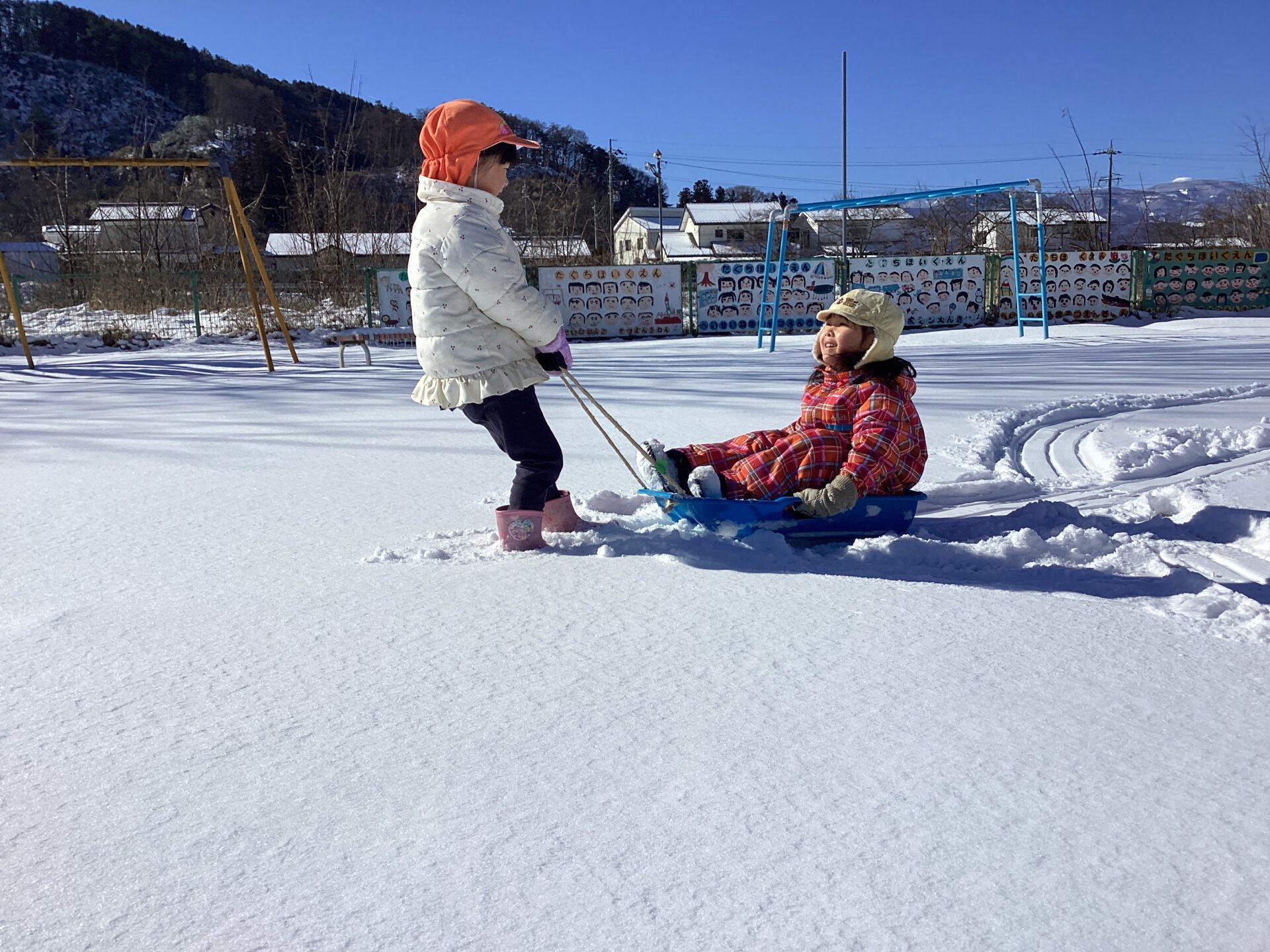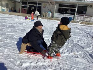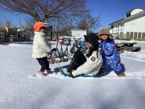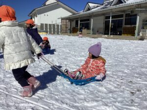 ・年長児にそりを引っ張ってもらってうれしかったから、自分も小さいお友達にやってあげよう・・!