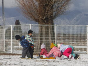 冬ならではの雪、氷、霜、霧・・・など日々の中での変化、発見を楽しんでいる年長児です。子どもの友達や保育者への発信を大切に受けとめ、一緒に触れて感じて楽しんでいきたいです。