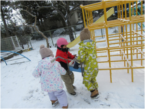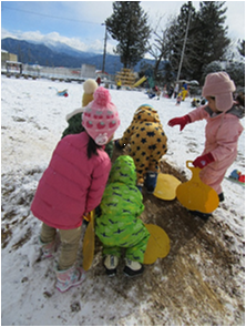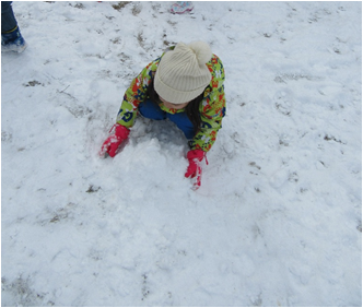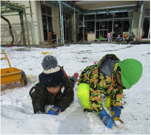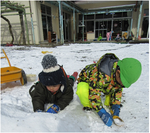 雪が降り、雪遊びができるのを楽しみにしていた子どもたちと園庭へ出ると、白銀の世界が!雪遊び王国に大変身です。雪でおままごとをしたり、スコップで掘ったり運んだり、様々な遊びが園庭のあちこちで展開されていきました。友だちとイメージを共有したり、協力して作ったり、自然に触れ楽しむことができました。また、クラスを超えての関わりも多く、雪という共通の自然物を通し、それぞれの遊びを楽しむ姿がありました。
