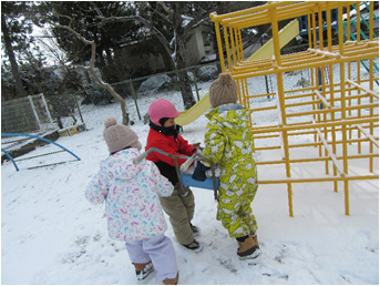 ・雪が積もり、園庭で雪遊びをする。