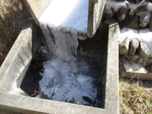 最強寒波が到来で未満児の庭の横を流れる川もがちがちに凍ってしまいました。