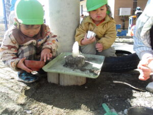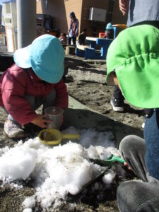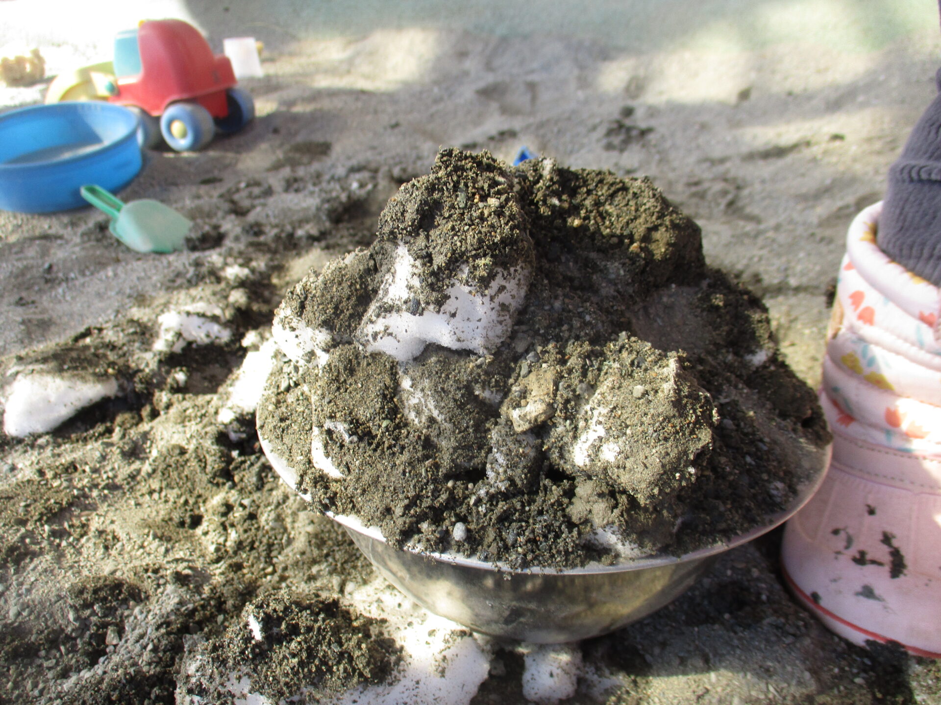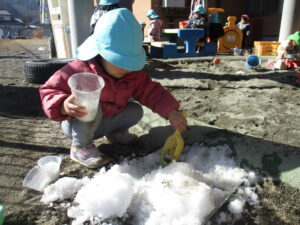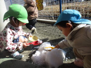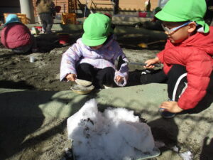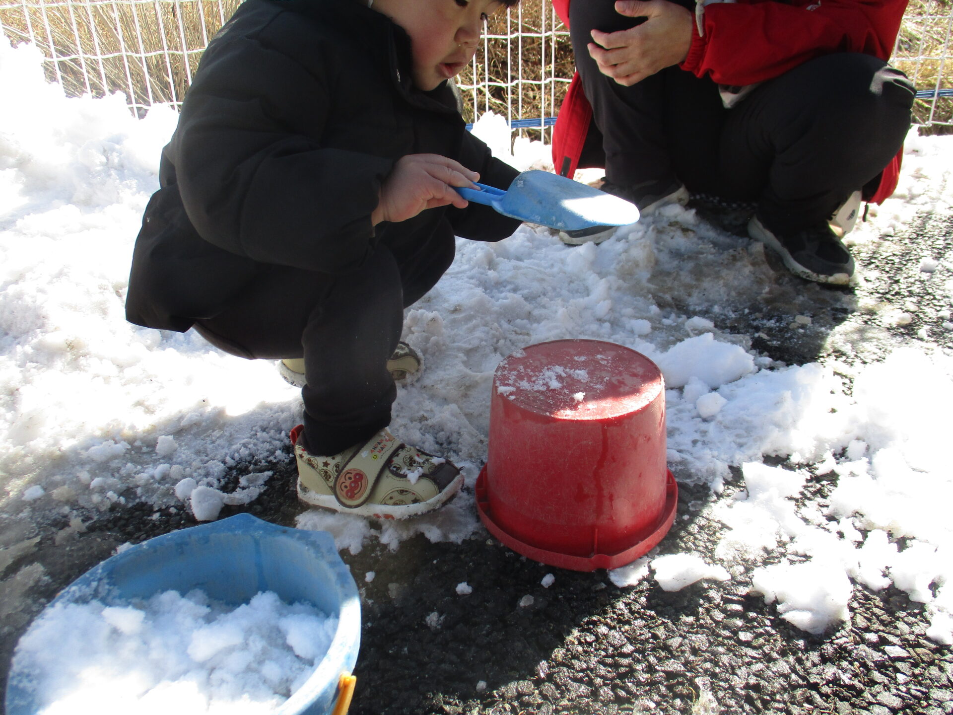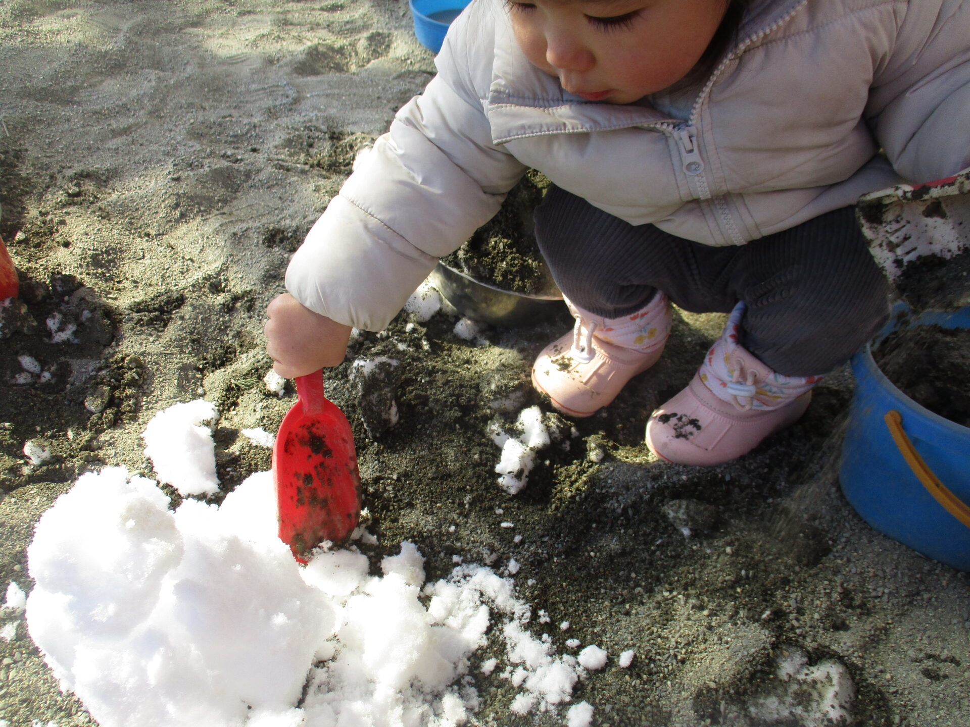 2歳児さんは雪を集めてひっくり返し、ケーキ作り!!