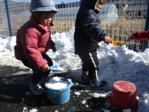0・1歳児さんは雪を集めることが楽しくてバケツやカップに集めてにっこり😊
