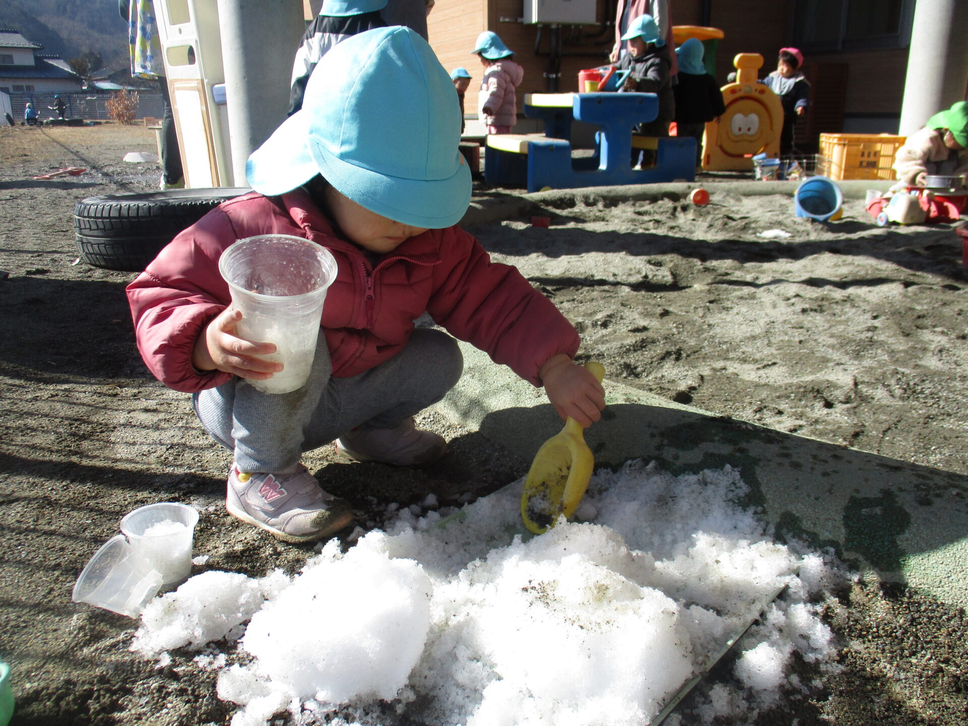0,1歳児さんは音や感触を楽しみ、2歳さんは見立てて作り上げることを楽しむなど年齢での楽しみ方は様々。保育士や友達と一緒に雪や氷を使って楽しむ、真似てみるを経験しています。