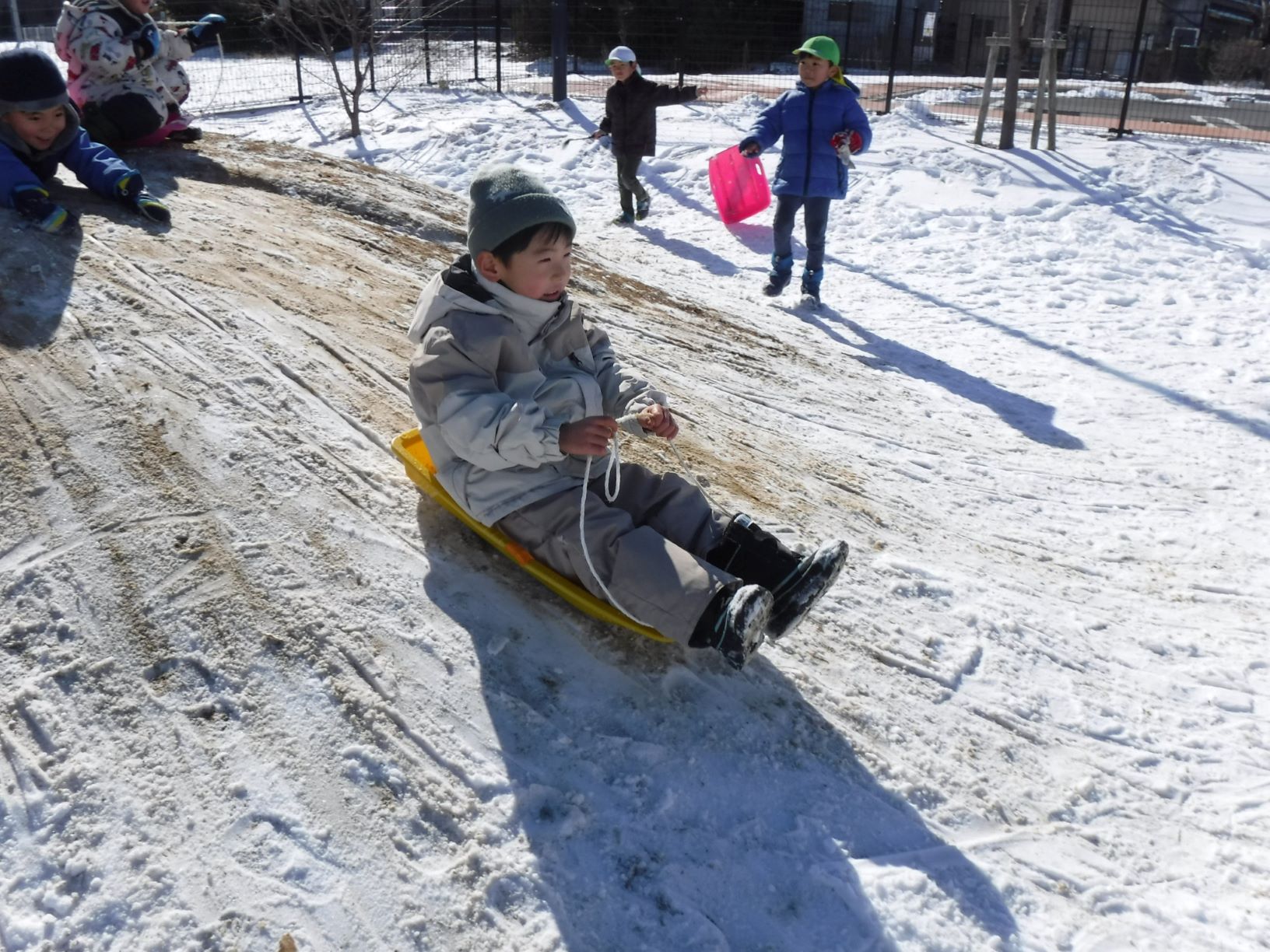 早速、雪山をおしりやそりですべって雪の感触を楽しみます。