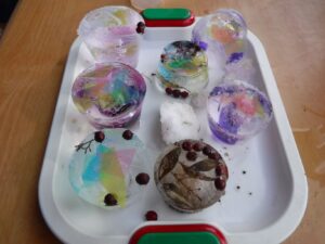 お日さまに氷をかざして楽しんでいます。