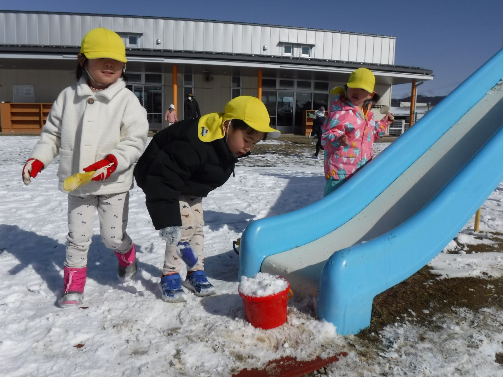「すべり台にも雪が積もってる!集めよう!」