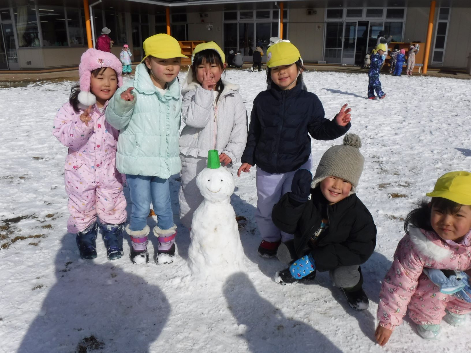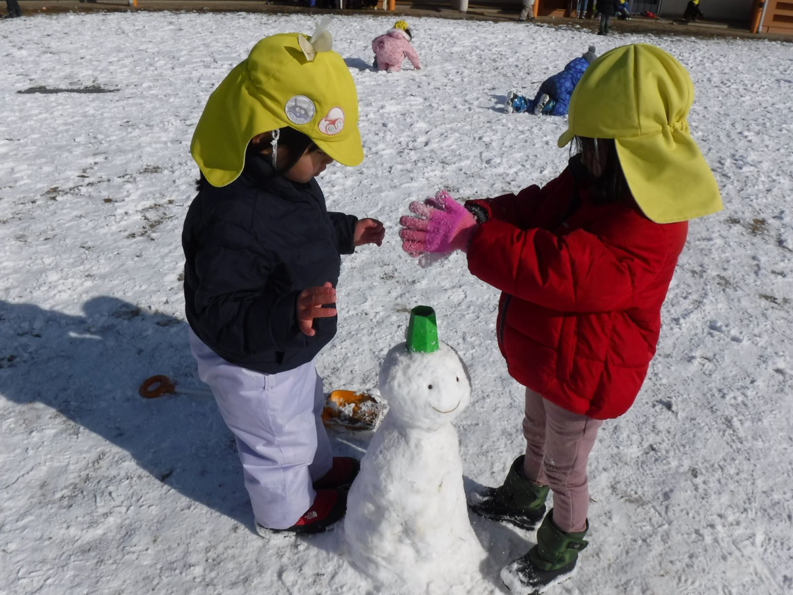 みんなでアイデアを出し合いながら雪だるまを作りました。