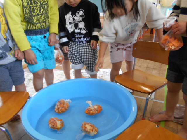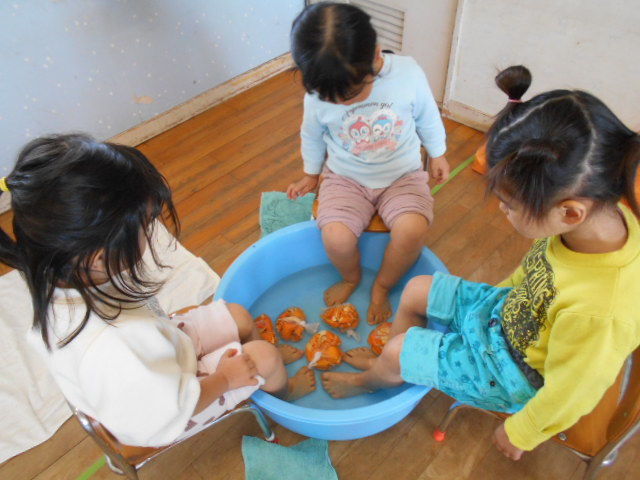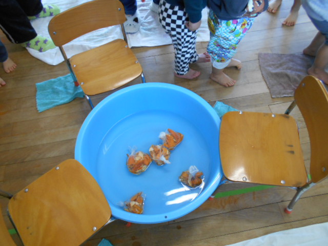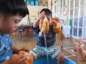 だんだんとダイナミックになってきてみかんを取り出す子も。触ってみてもおもしろいね。