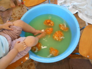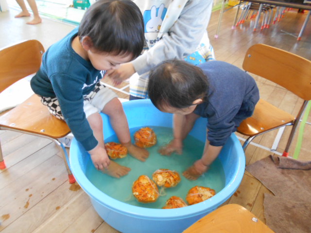 「入ってみたいね」という声もちらほら。保育園でもみかん風呂をやってみようと思い、みんなで準備をしました。