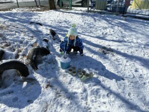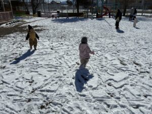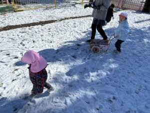 未満児クラスのお友達も園庭に出てきて、みんなで雪遊びを楽しみました♪