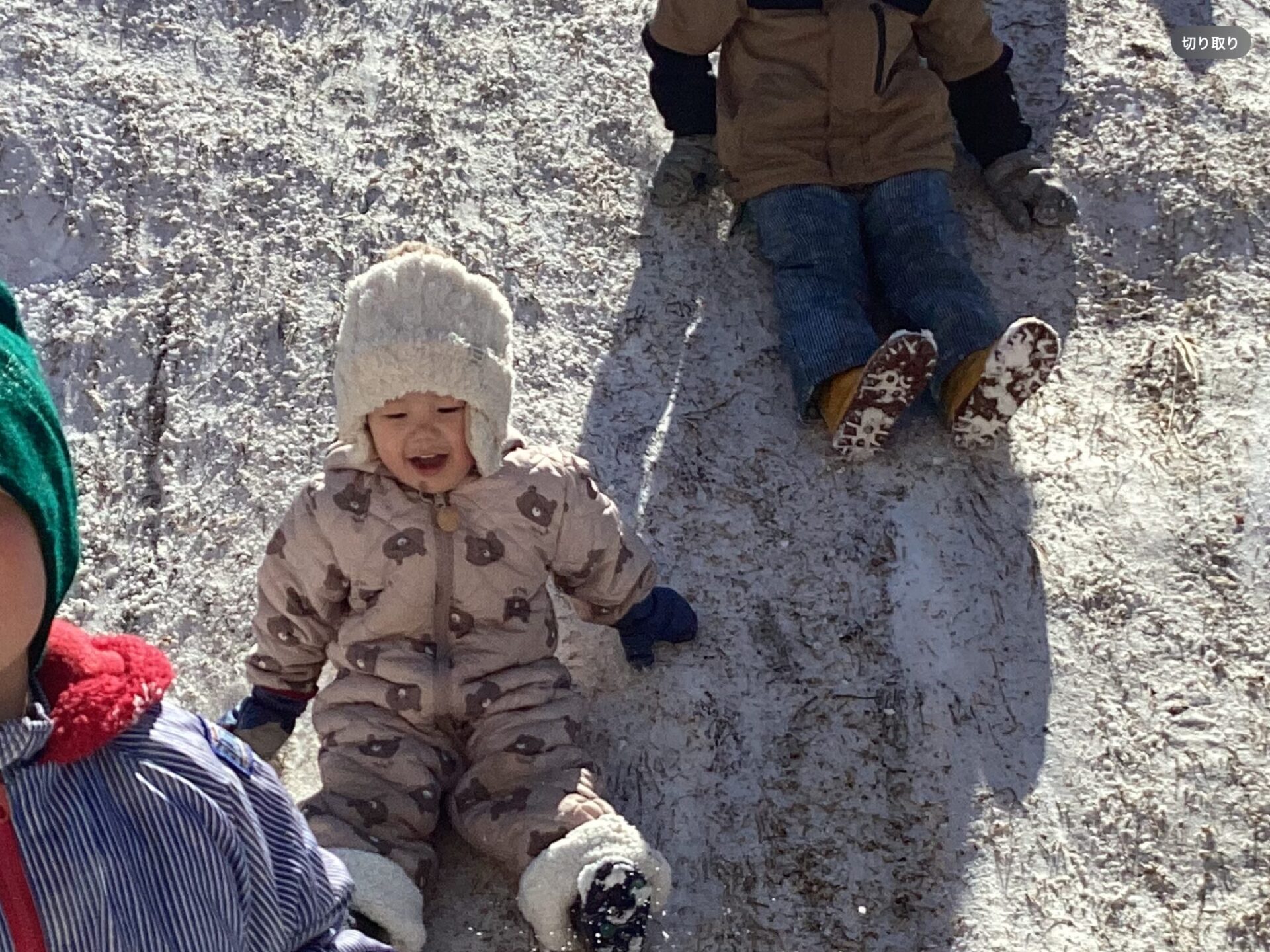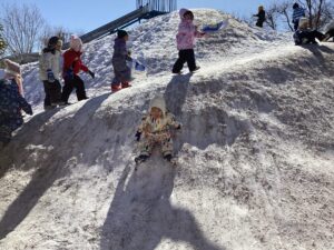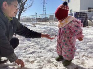 お外が好きな1歳児さん。雪の上を歩くと、いつもと違う感触や音がしたね。雪のお外も大好きになって楽しく遊んでほしいなと願っています。