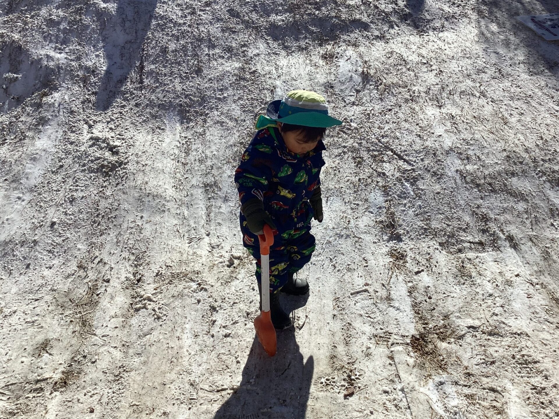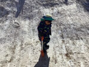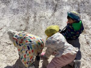 スコップを持っているお友だちのところに集まってきました。「ここ、掘るの?」いっしょに掘ってみようとしましたが・・・全然掘れない「なんでこんなに固いんだ?」