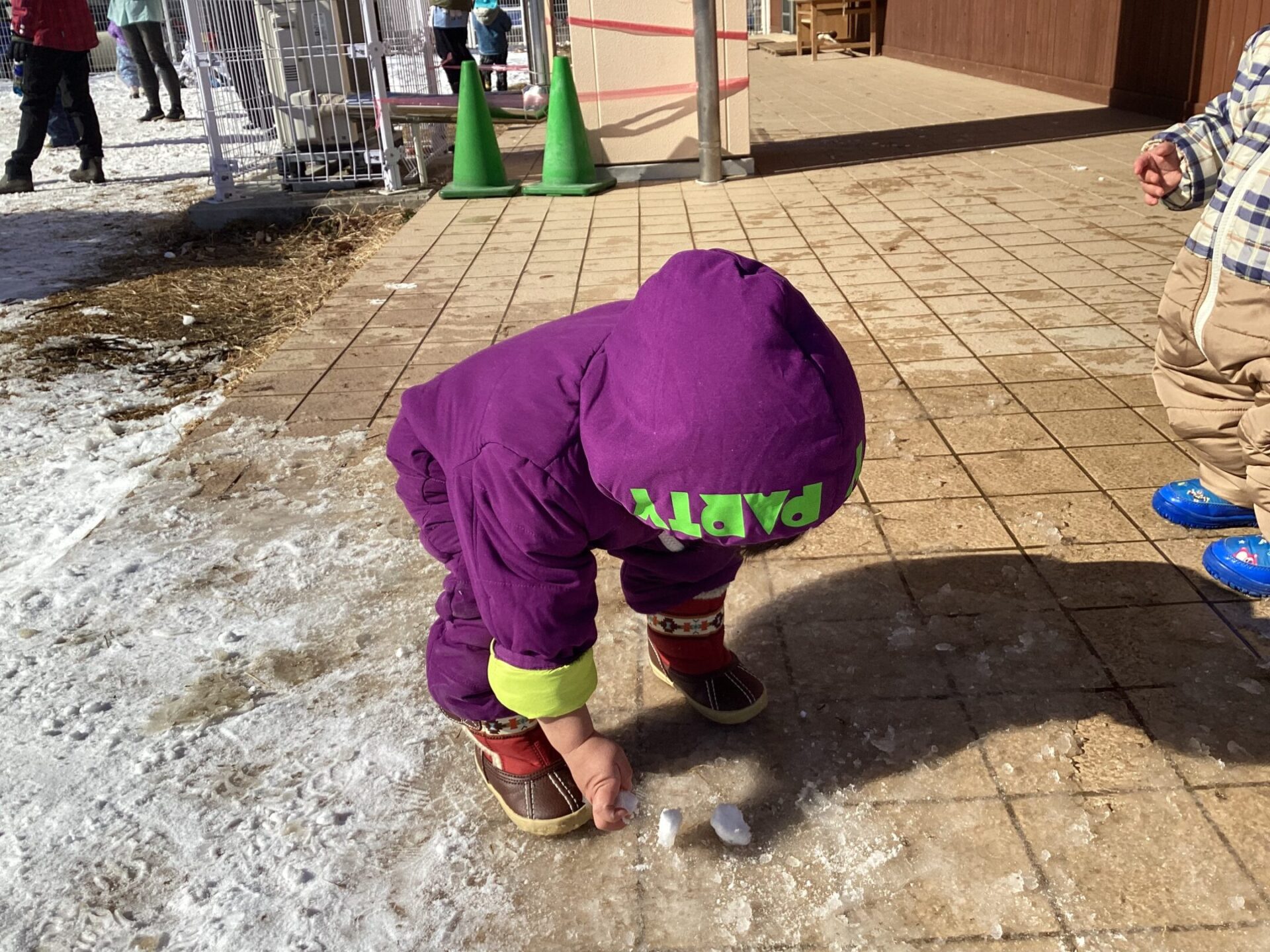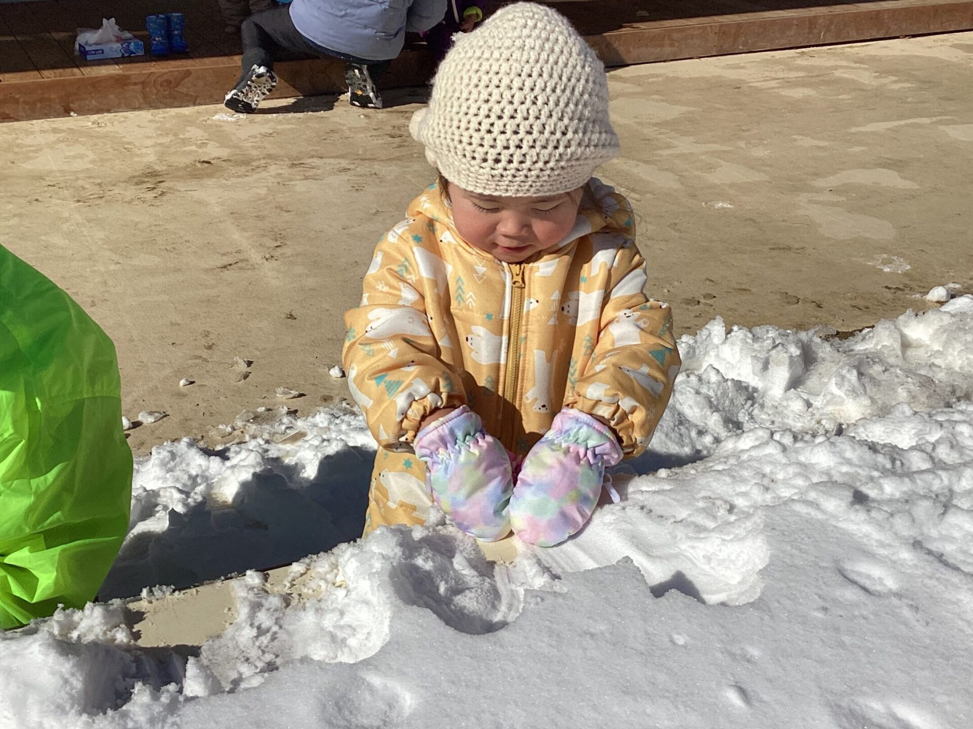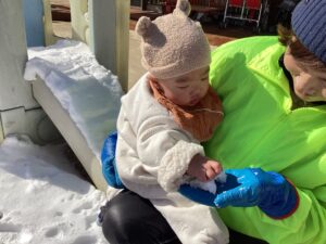 初めて雪を見る0歳児さん。雪の冷たさ、感触など冬ならではの自然の楽しさをいっぱい感じてほしいです。