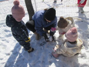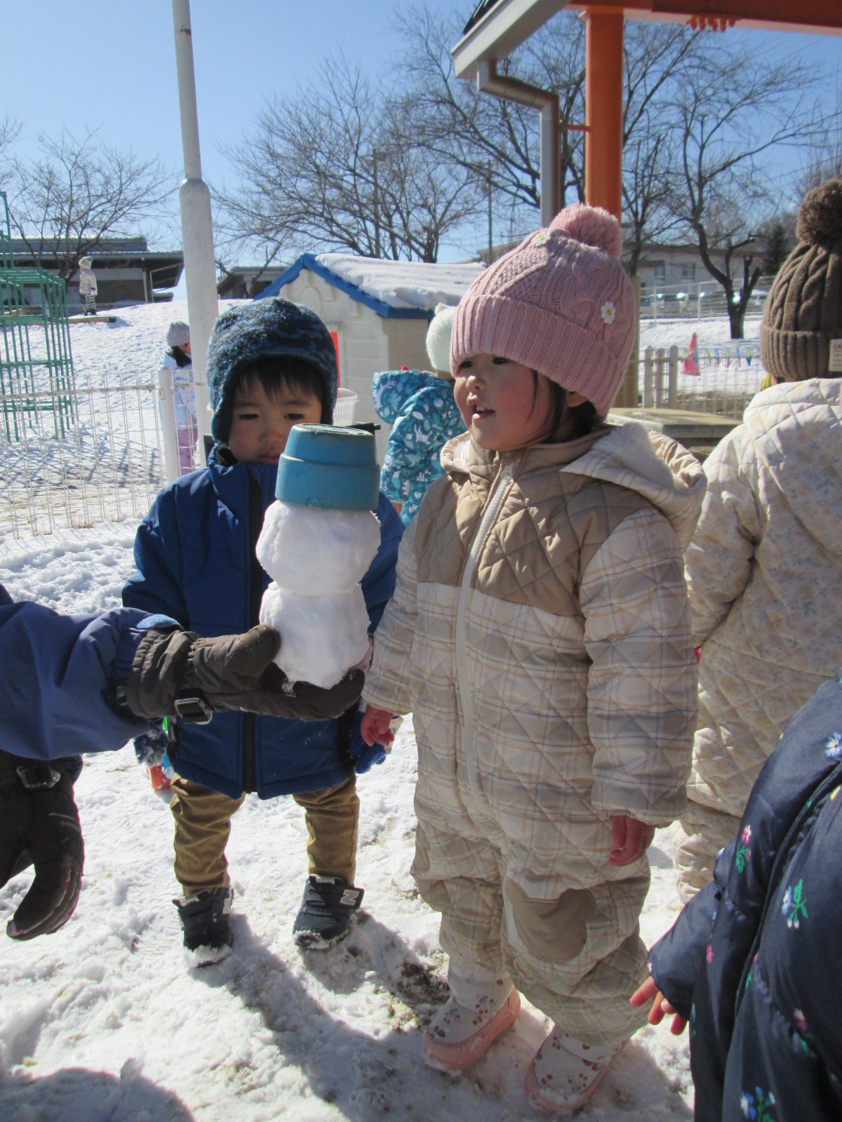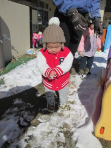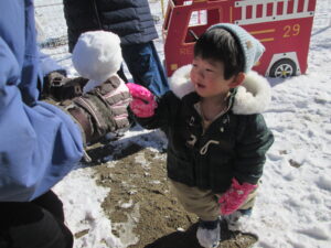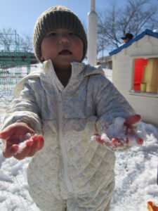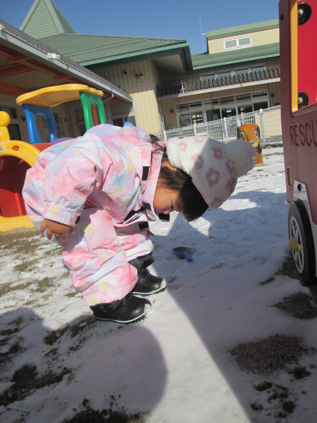 家で遊んだ経験のある子も、初めて触る子もいました。「冷たいね」と保育士と一緒に触ったり、雪玉にしてもらって持ち歩いたりと、一人ひとり雪の冷たさを感じていました。