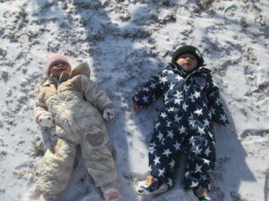 雪遊びできるくらい雪が降りました。窓から外を指さして、「雪だ!」と嬉しそうな子どもたち。