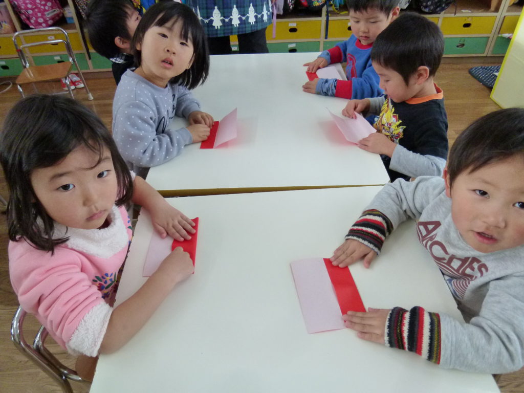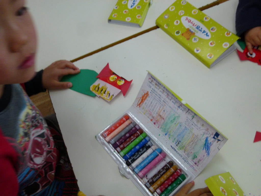 獅子舞の顔は折り紙で。角と角を合わせたり線に合わせたり丁寧に折っています。