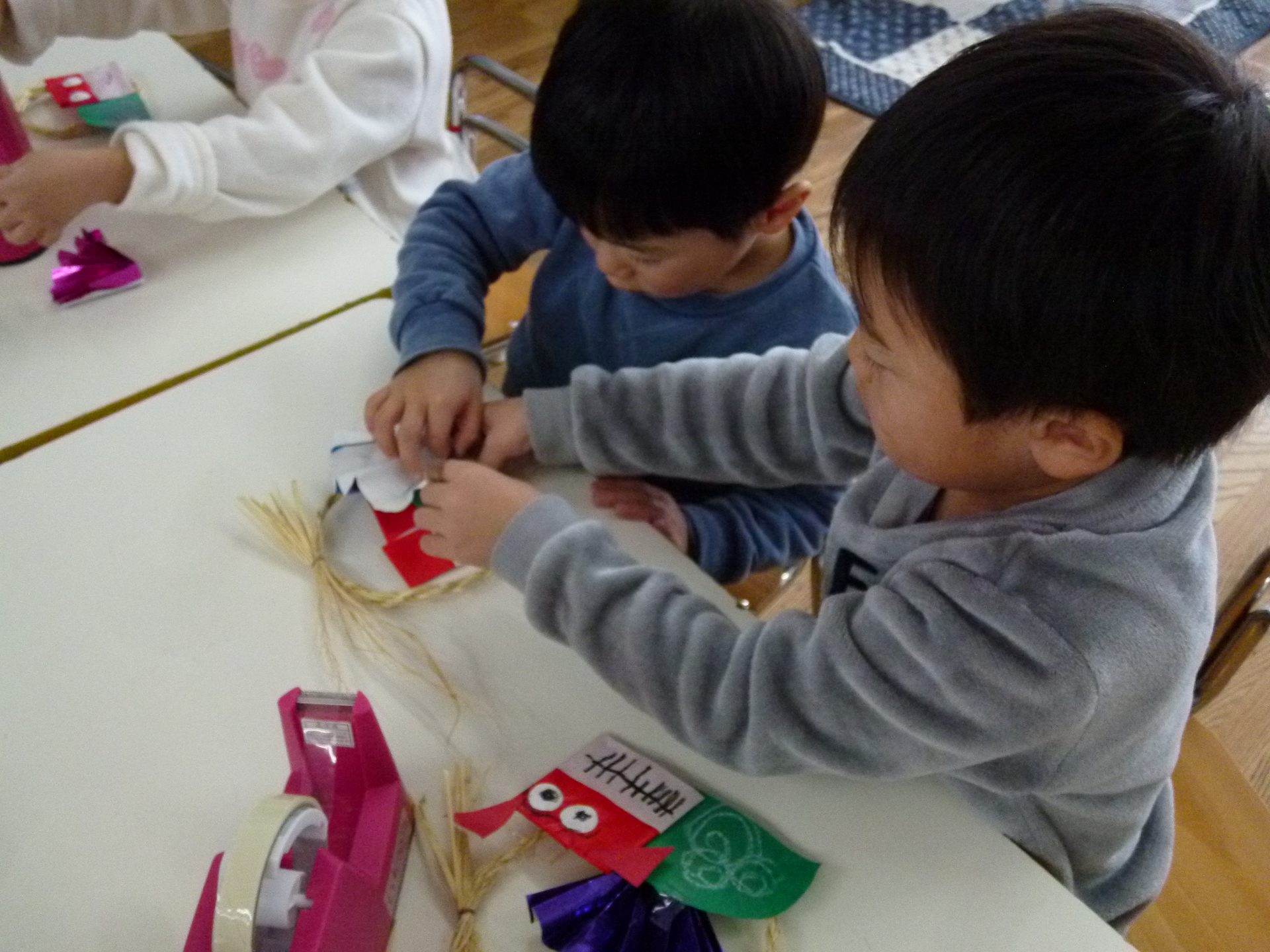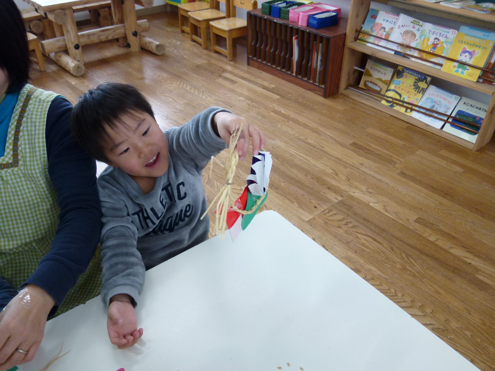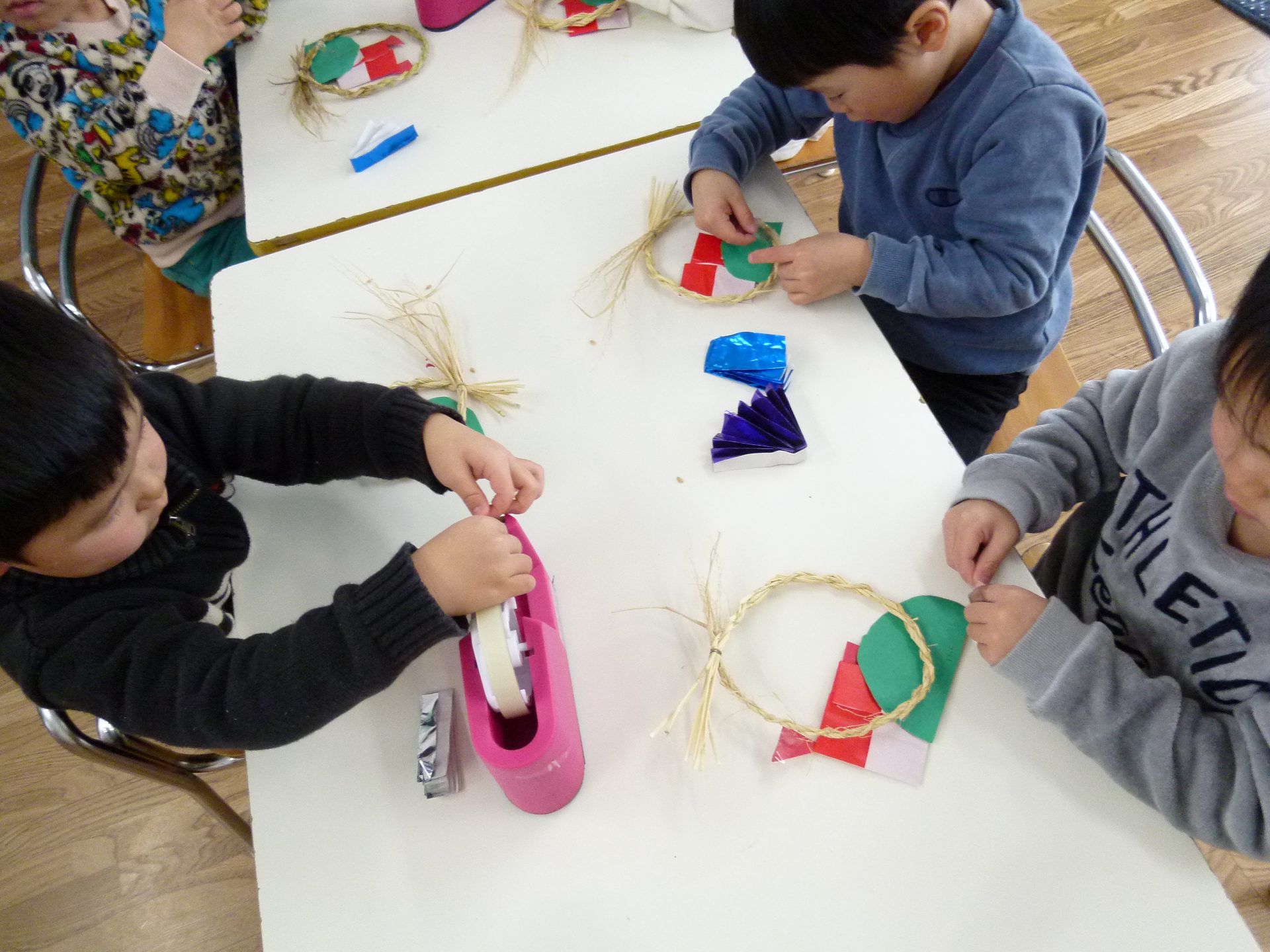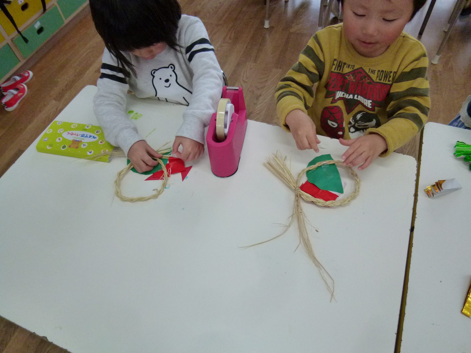 しめ縄ができ飾ると「これで新しい年になっても神様が来てくれるね!」と嬉しそうに話す子ども達です。昔ながらの伝統的な風習に触れ自分たちで作り飾る意味も知ることが出来ました。明日から保育園はお休みになります。お家や近所、出かけ先でもきっとお正月飾りを見かけるかと思います。見かけたときに保育園で作ったことや、飾る意味などお家の人との会話ででてきたらいいなと思います。年明け元気な子ども達の姿を見ることを楽しみにしています。そして来年も子ども達と一緒にたくさん遊びいろんな発見や喜びを共有し成長していきたいと思います。