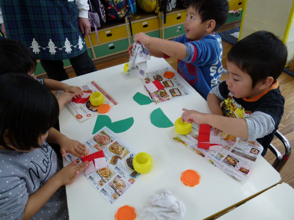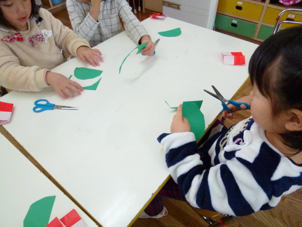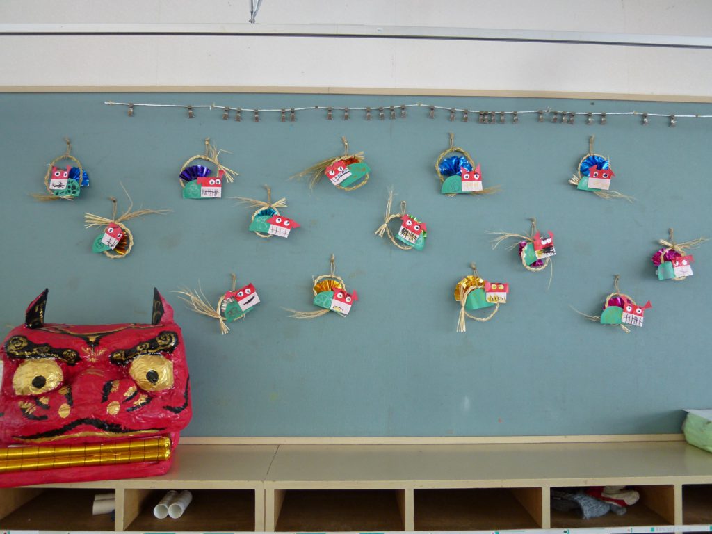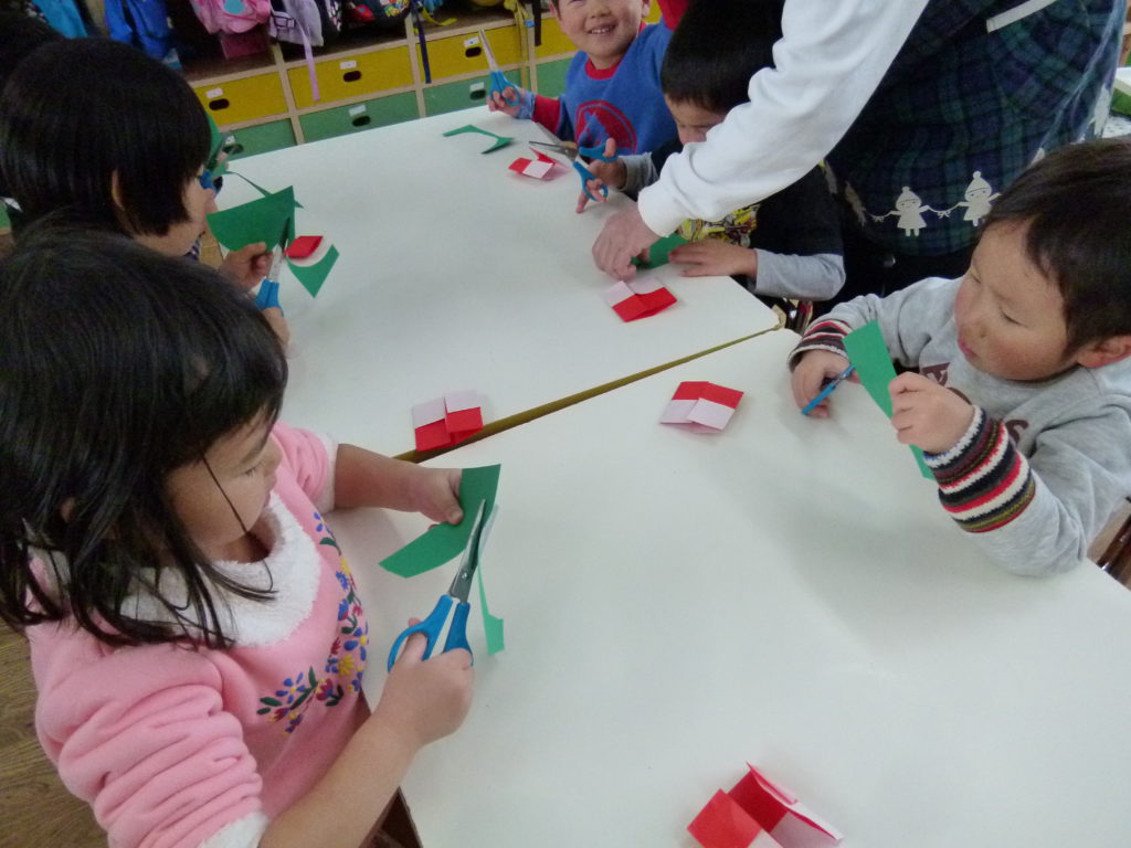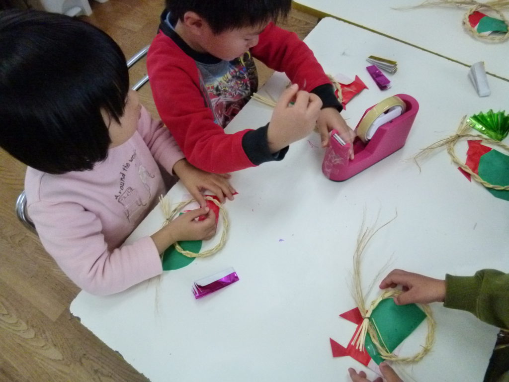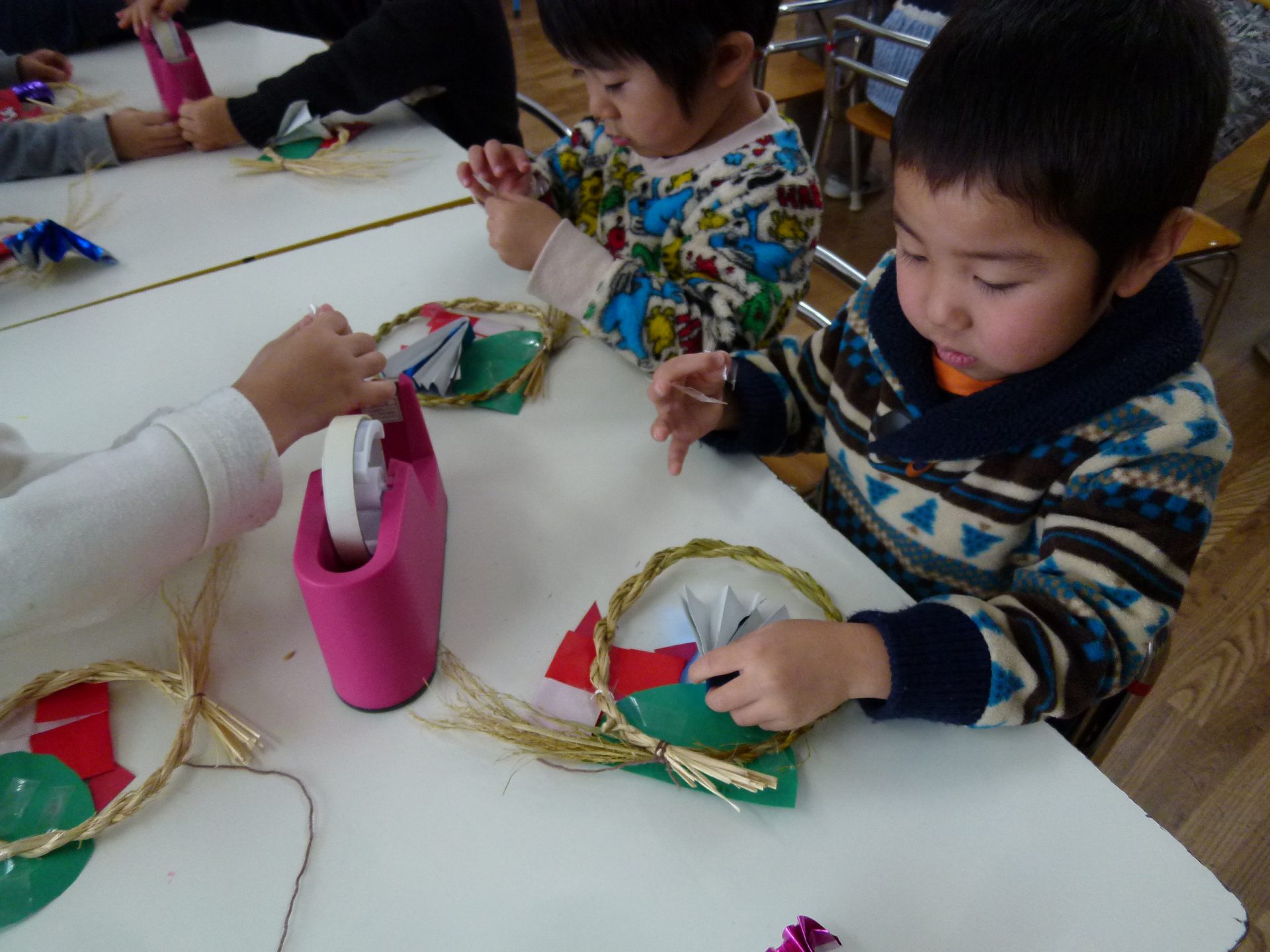 しめ縄ができ飾ると「これで新しい年になっても神様が来てくれるね!」と嬉しそうに話す子ども達です。昔ながらの伝統的な風習に触れ自分たちで作り飾る意味も知ることが出来ました。明日から保育園はお休みになります。お家や近所、出かけ先でもきっとお正月飾りを見かけるかと思います。見かけたときに保育園で作ったことや、飾る意味などお家の人との会話ででてきたらいいなと思います。年明け元気な子ども達の姿を見ることを楽しみにしています。そして来年も子ども達と一緒にたくさん遊びいろんな発見や喜びを共有し成長していきたいと思います。