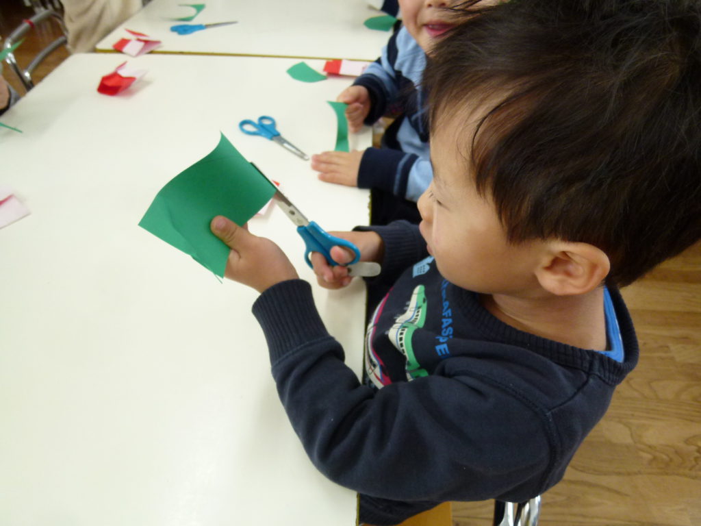 獅子舞の顔ができると、次は体の部分。線に沿ってハサミで切ります。ハサミの持ち方や紙を持つ手の位置などハサミを使うのも大分上手になってきました。切り終わると友達と見せ合いしている姿も見られます。