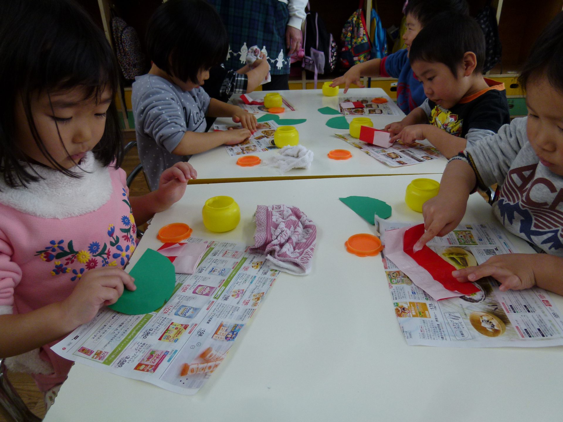 獅子舞の顔と体を合体させます。使う物はのり。これも何度も子ども達と一緒に使い方を確認してきました。「“1”の指(人差し指)だよね!」