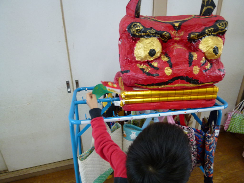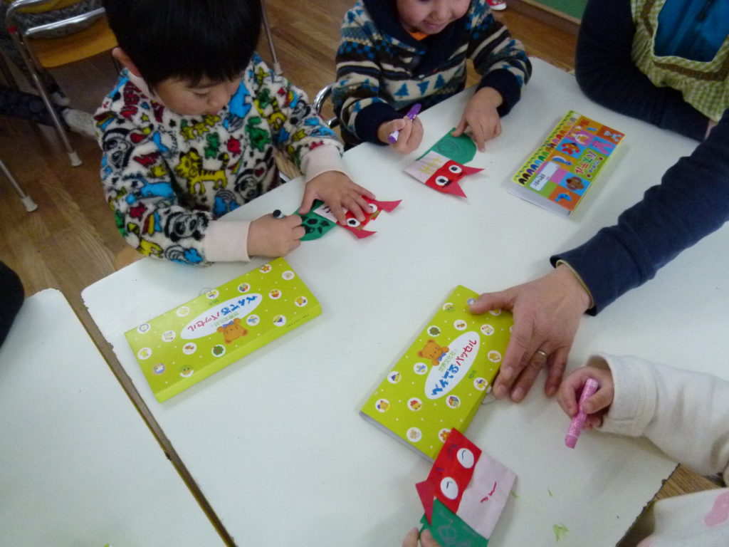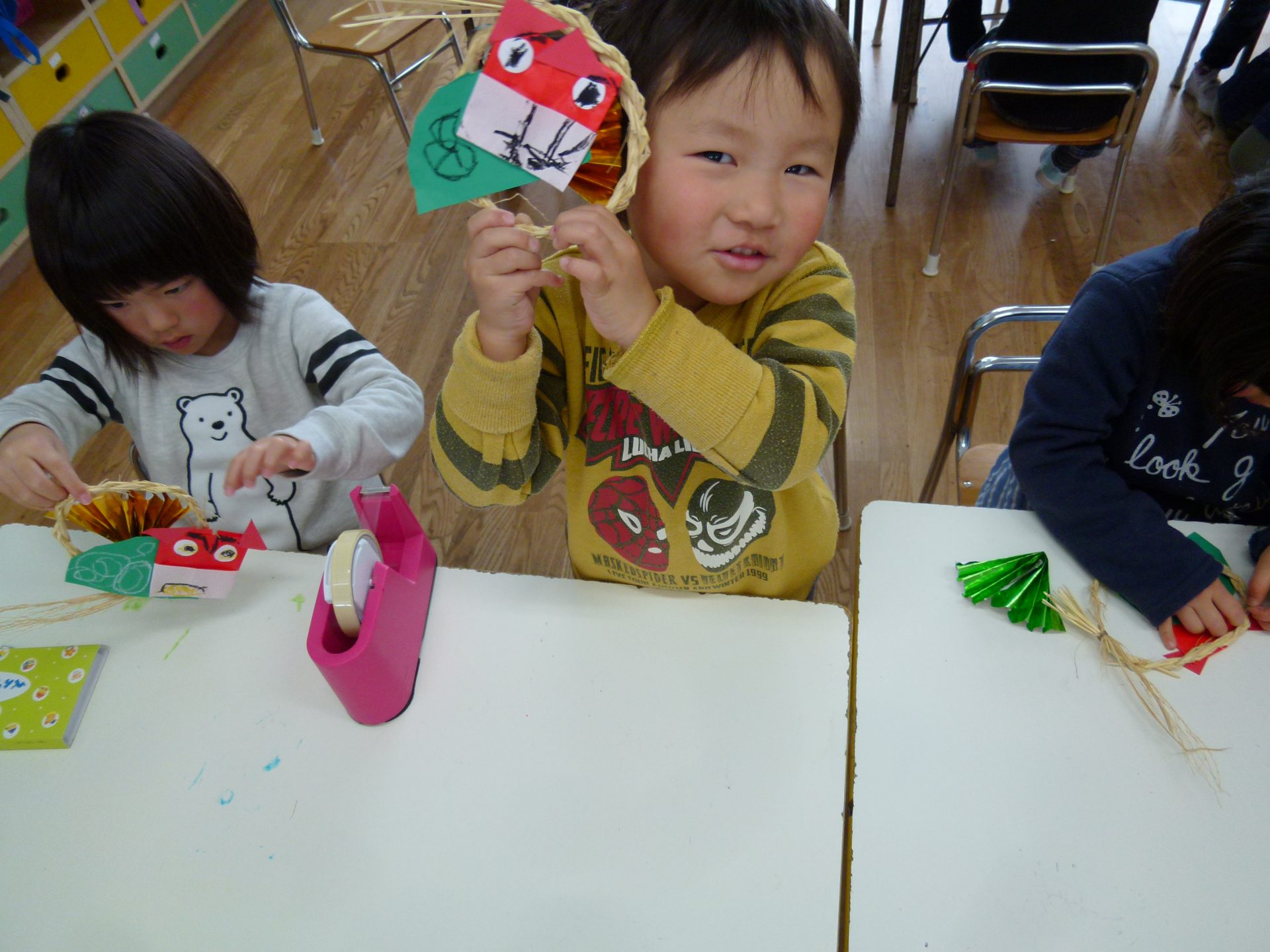 しめ縄には子ども達お馴染みの獅子舞を作って付けることに。保育園には大きな手作り獅子舞があるので子ども達と見ながら一緒に作りました。