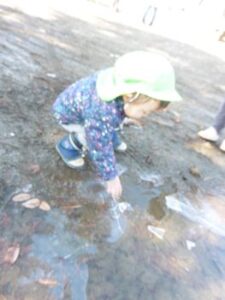 足で踏んで割れてきたところから氷をとろうと頑張っていました。