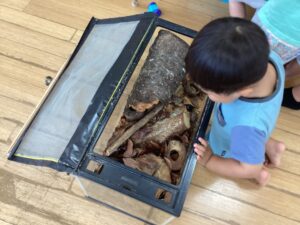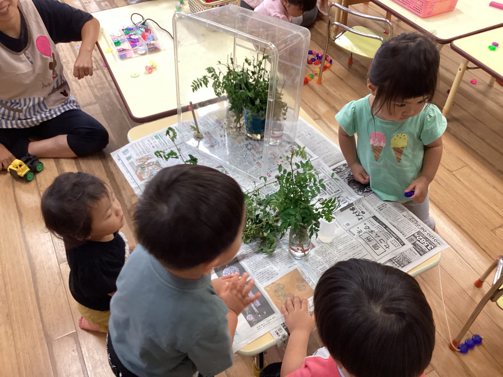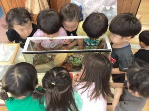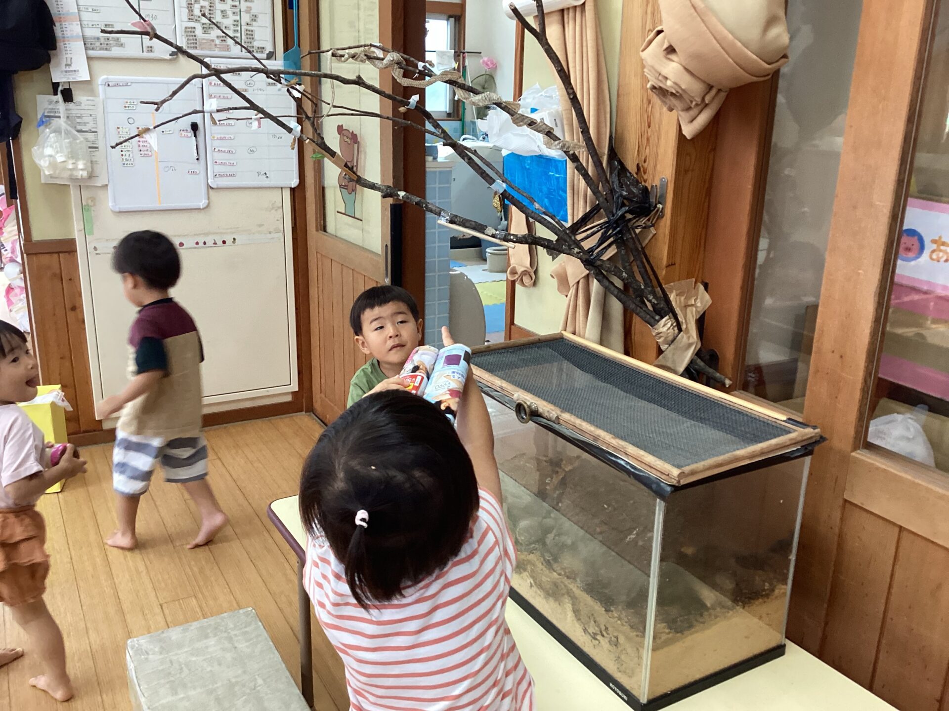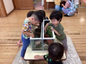 虫と共にいることで、他者とも積極的な関わり(給食の先生も含め)が見られ、双眼鏡を作って観察するなど遊びに広がり、気づいたことを自分から発信していく力へと繋がりも感じました。