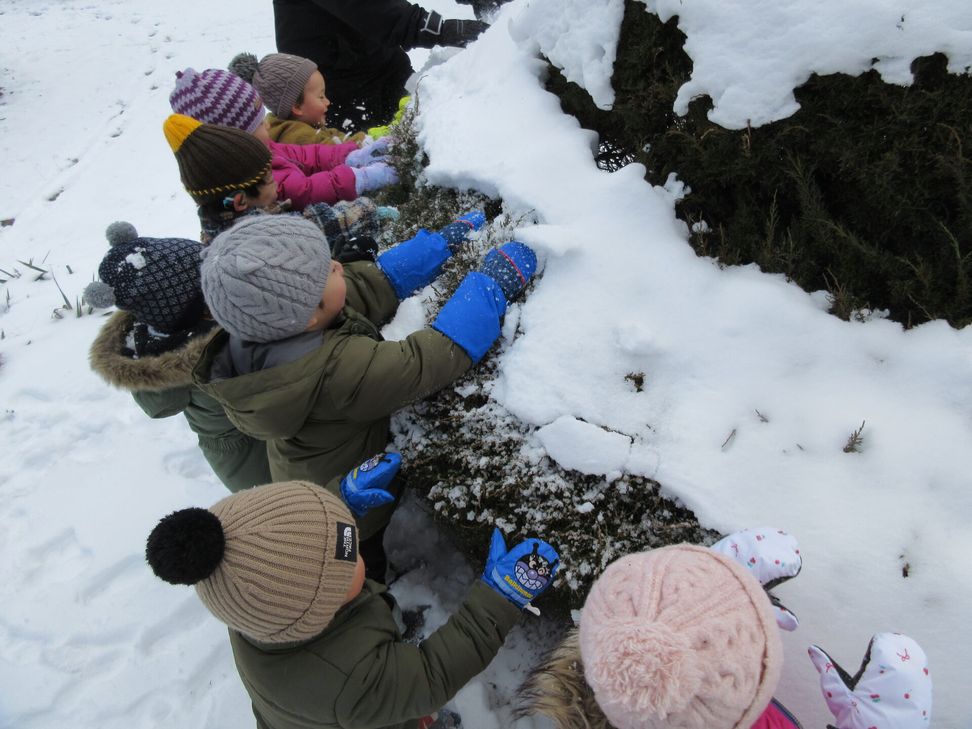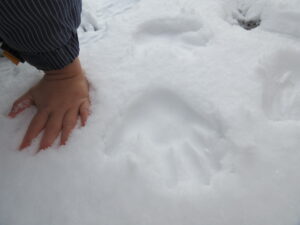 雪の上にできた足跡を見て、跡が残ることに気づき、次は手を押し当てる子どもたち。