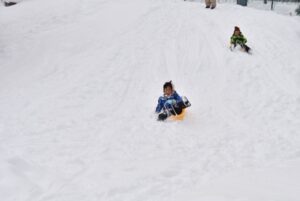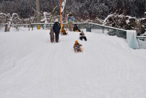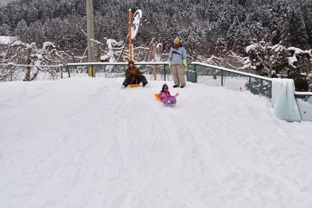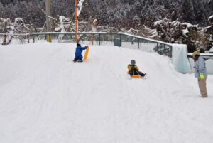 築山に上ったら、そりすべりレッツゴー